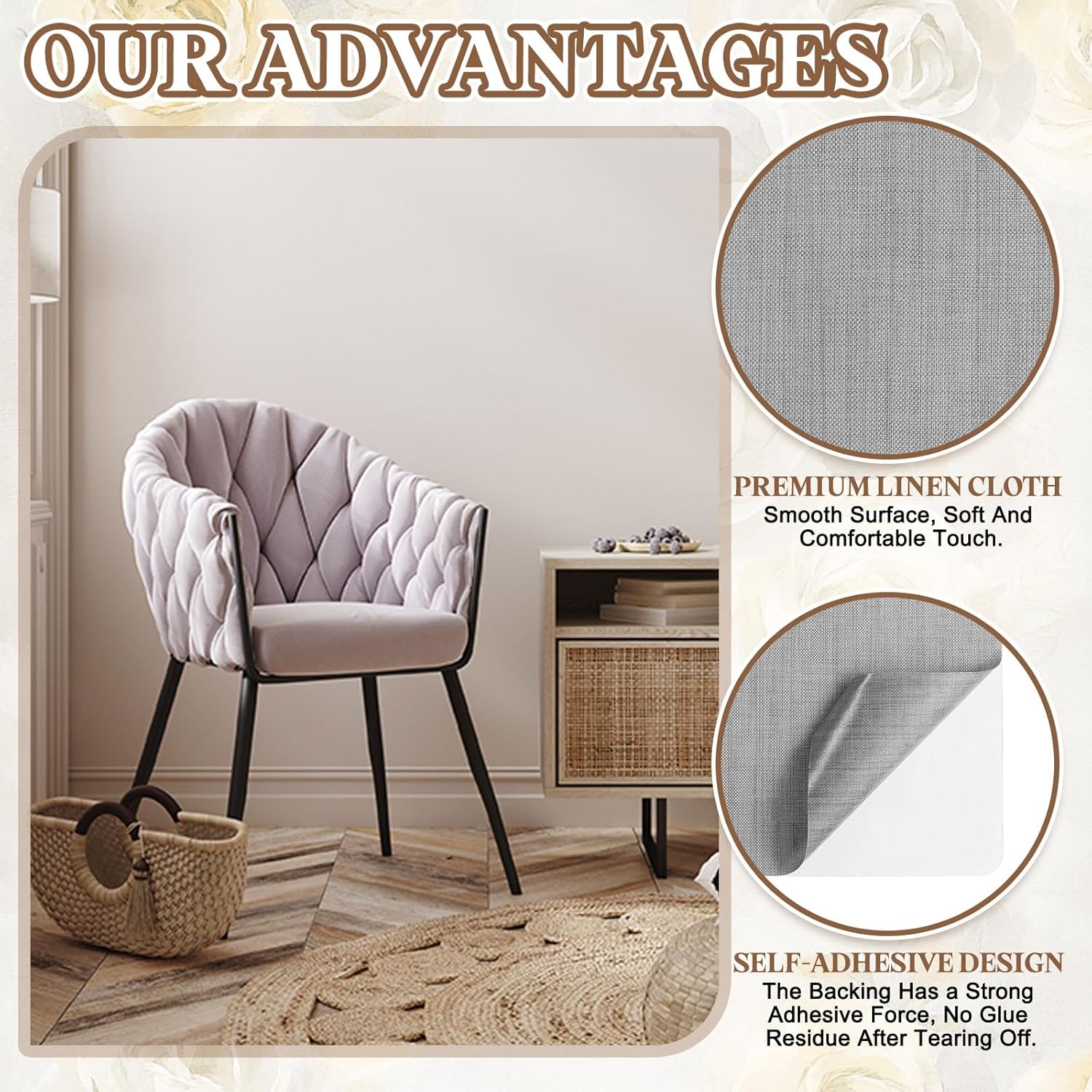 - Application: This self-adhesive linen patch is very suitable for various home and car scenes, such as repairing furniture such as sofas, tables and chairs, clothes, backpacks, handbags, car seats, etc. It can be used for various home crafts and decorations, and can also be used for outdoor tents, sails, hammocks, sleeping bags, outdoor furniture covers, luggage bags, etc