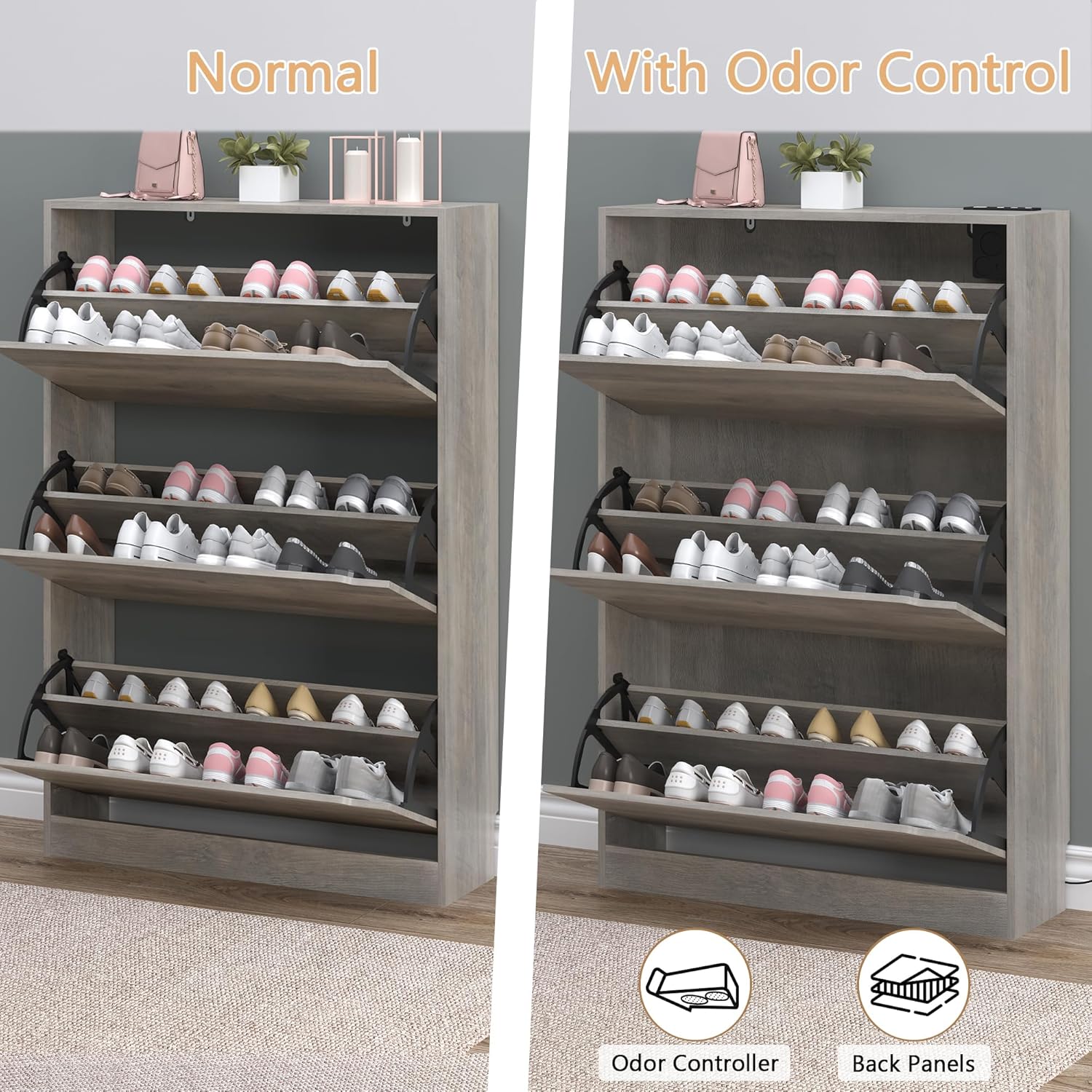 Shoe Cabinet with Odor Control and Back Panels, Deodorizing Slim 3-Flip Shoe Storage Cabinet for Entryway, Freestanding Hidden Shoe Rack Organizer for Entrance, Hallway, Bedroom