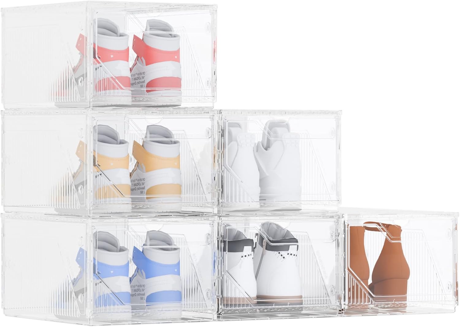 6 Pack Upgraded XX-Large Storage Organizer with Magnetic Door, New structure is more stable, Thicken & Sturdy Clear Stackable Interconnectable Shoe Box for Entryway, Closet, Under Bed