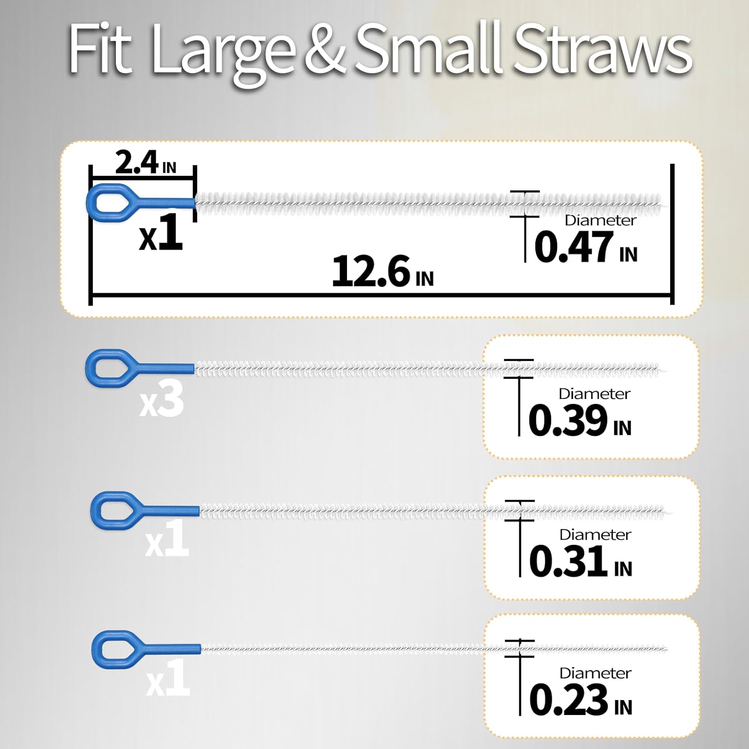 - Extra-Long Bristles for Deep Cleaning - Say goodbye to stubborn residue hiding in your straws! Our 12.6 Inch straw brush( with 4 sizes: 0.23",0.31",0.39",0.47") features extended bristles that reach every nook and cranny, ensuring a thorough clean for straws of all lengths. Perfect for those hard-to-reach spots!