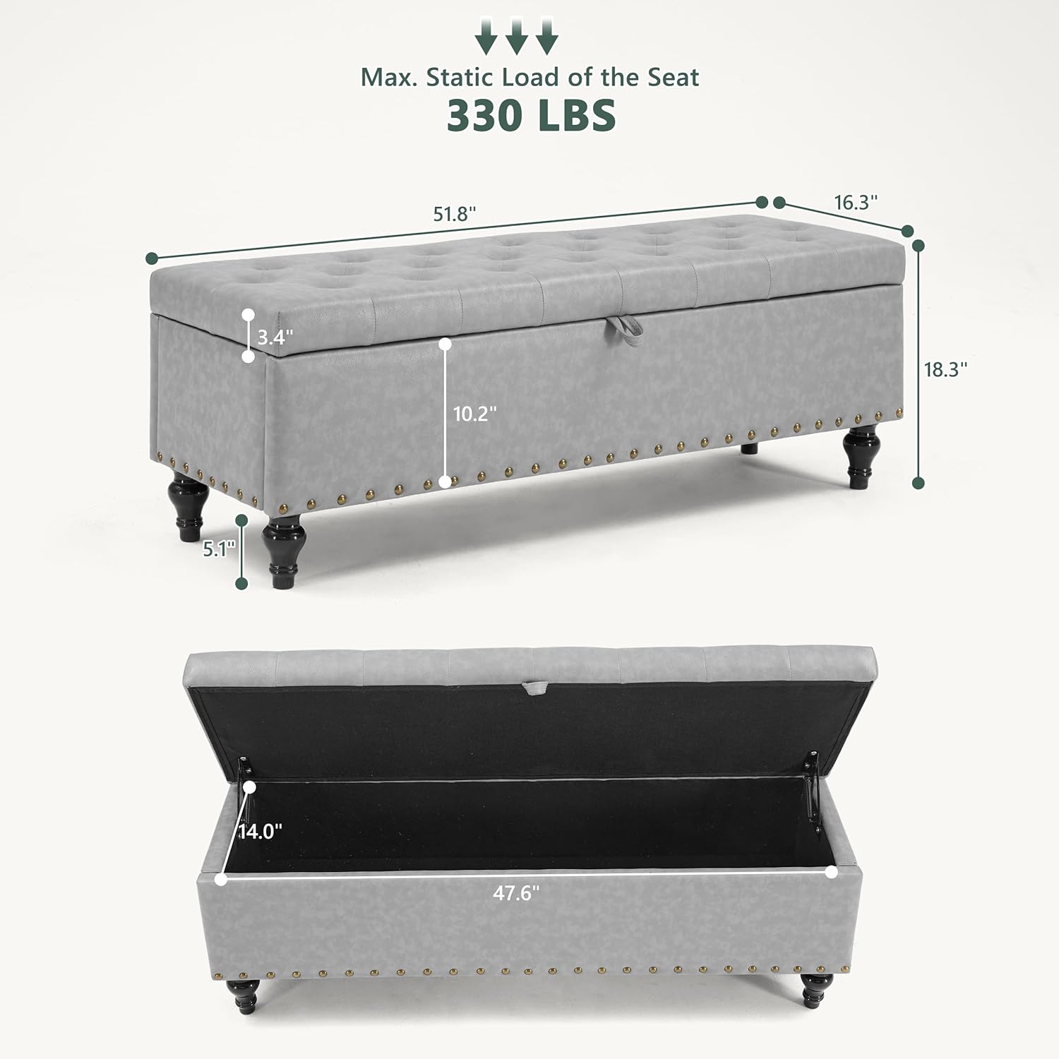 51.8’’ Storage Ottoman Bench, Faux Leather Ottoman with Storages, Window Benches Holds up to 330lbs, Upholstered Storage Bench for Bedroom, Living Room, Entryway and Family Room, Light Gray