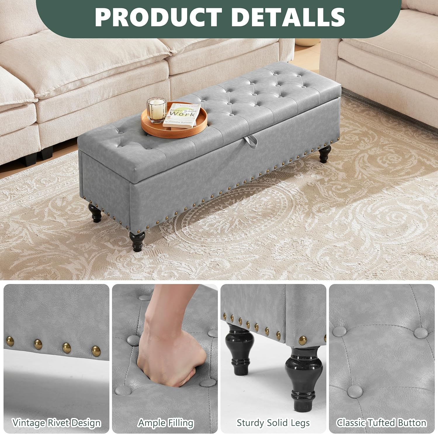 - Ample Storage Space: This leather ottoman with storage offers a roomy compartment (14"D × 47.6"W × 10.2"H), holding up to 29.43 gallons. Easily store blankets, books, and more. This storage bench helps keep your room neat, organized, and clutter-free