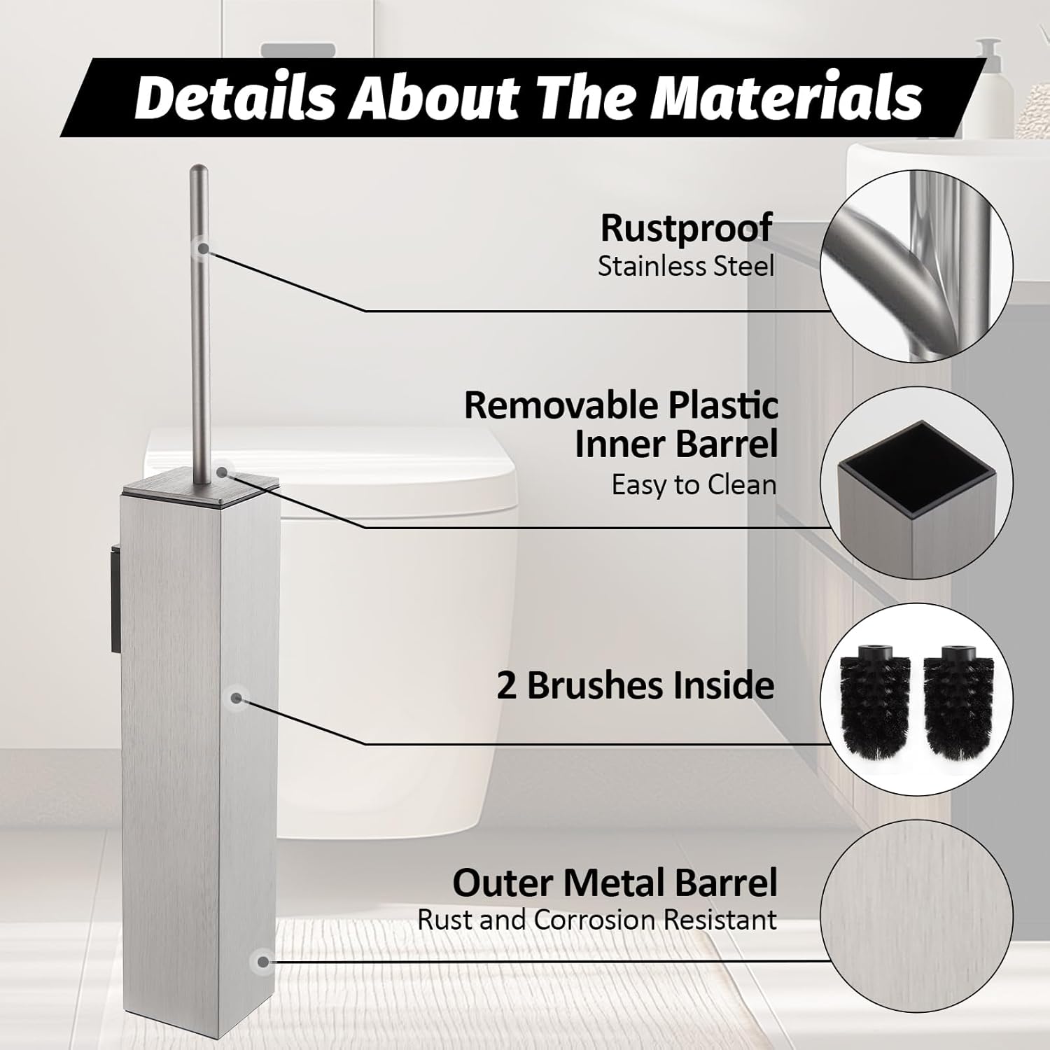 - Durable & Rust-Resistant - Made with an aluminum alloy cup and stainless steel handle, this toilet brush is designed to resist rust and withstand humid environments.