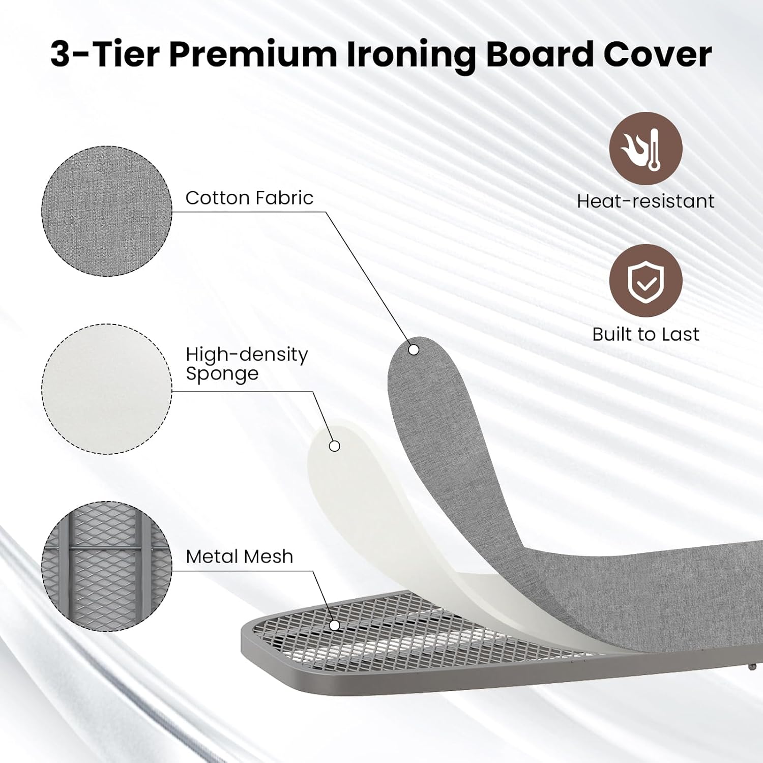 - 3-Layer Premium Cover: The 42" x 14.5" ironing surface of this ironing board is equipped with a 3-tier ironing board cover, including a cotton fabric outer layer, a high-density sponge filling and a bottom metal mesh, offering a heat-resistant and built-to-last ironing experience.