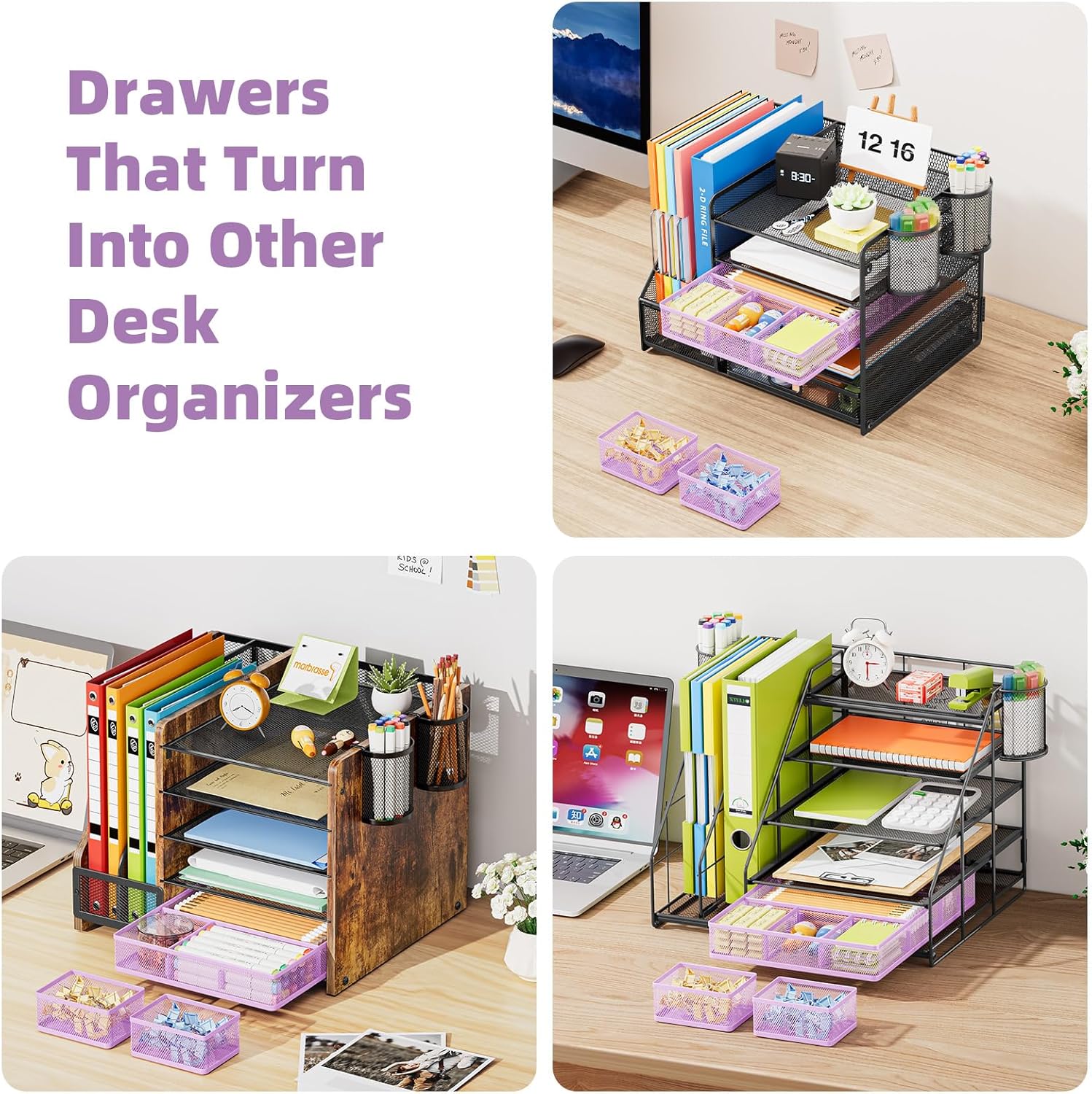 Marbrasse 3 Packs Desk Drawer Organizers, Metal Mesh Dividers with 9 Adjustable Compartments, Pen Organizer for Drawer Tray Box Accessories for Desktop,Kitchen, Makeup(Purple)