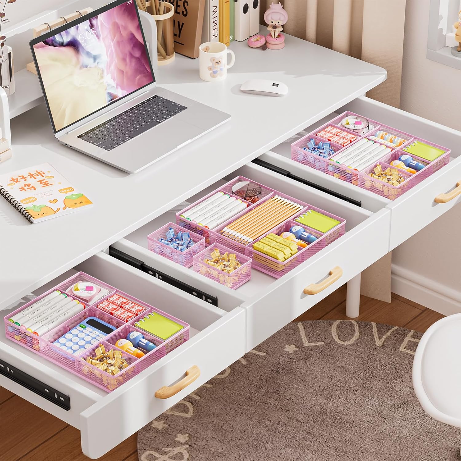 Marbrasse 3 Packs Desk Drawer Organizers, Metal Mesh Dividers with 9 Adjustable Compartments, Pen Organizer for Drawer Tray Box Accessories for Desktop,Kitchen, Makeup(Pink)