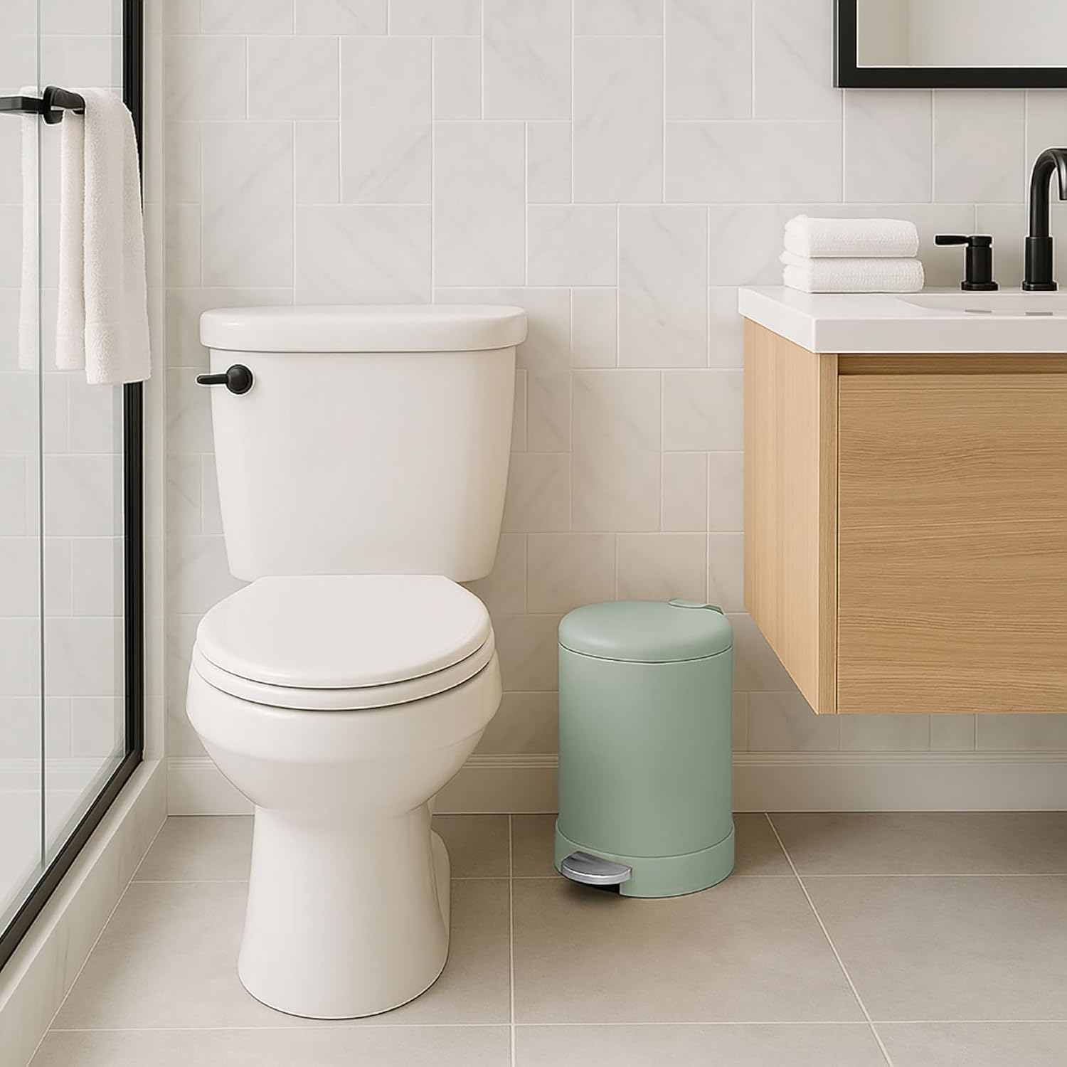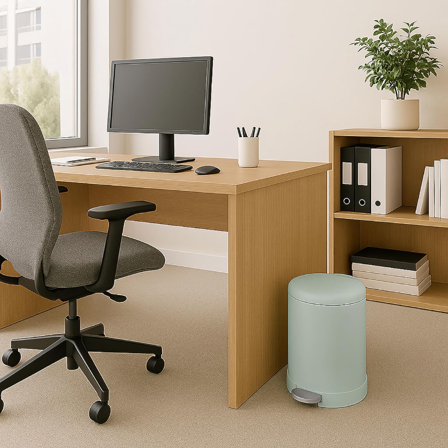 - SMALL TRASH CAN WITH LID - The 1.2-gallon capacity makes this compact trash can the perfect size for rooms with limited space. Makes a great office trash can for near desk, lidded bathroom wastebasket, and tiny step can for apartment kitchens.