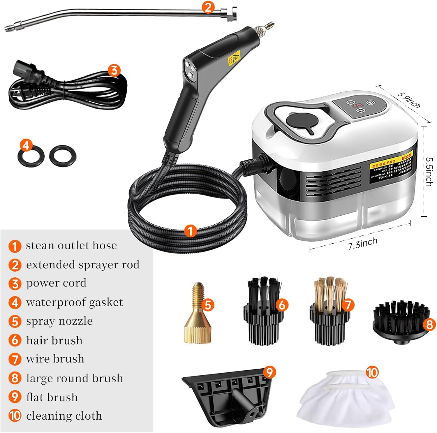 - Included Components : 1*Steam machine with tank, 1* power cord, 1* steam pipe, 1* large plastic brush, 1* small plastic brush, 1 steel brush, 1* extension rod, 2*gasket, 1*Flat brush, 1*Cleaning Cloth Sleeve, 1* user manual 1*Steam machine with tank, 1* power cord, 1* steam pipe, 1* large plastic brush, 1* small plastic brush, 1 steel brush, 1* extension rod, 2*gasket, 1… See more