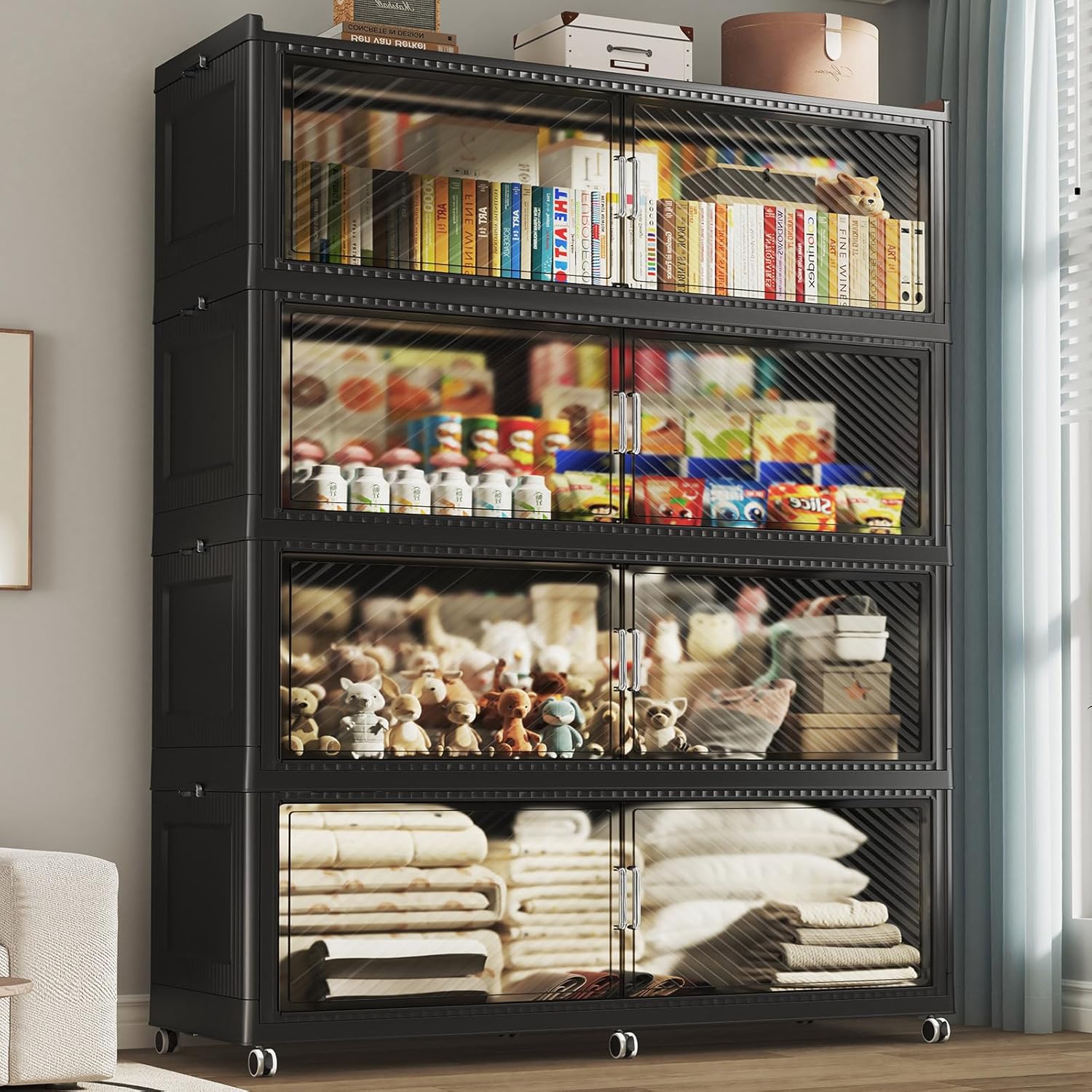 320GAL Extra Large Storage Bins with Lid, 1280QT Collapsible Organizer with Wheels, Stackable Closet Cabinet with Doors, Folding Storage Containers for Home, Office, Dorm, 4Pack Black