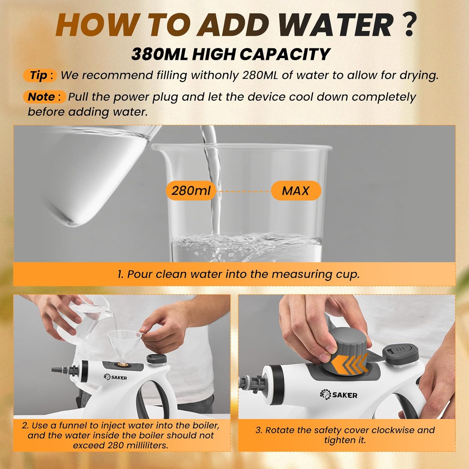 - 【Big Water Tank】The Saker steam cleaner features a generous 350ml water tank (recommended maximum fill: 280ml), allowing you to focus on continuous cleaning without constant refills, providing ease and comfort even for extended tasks.
