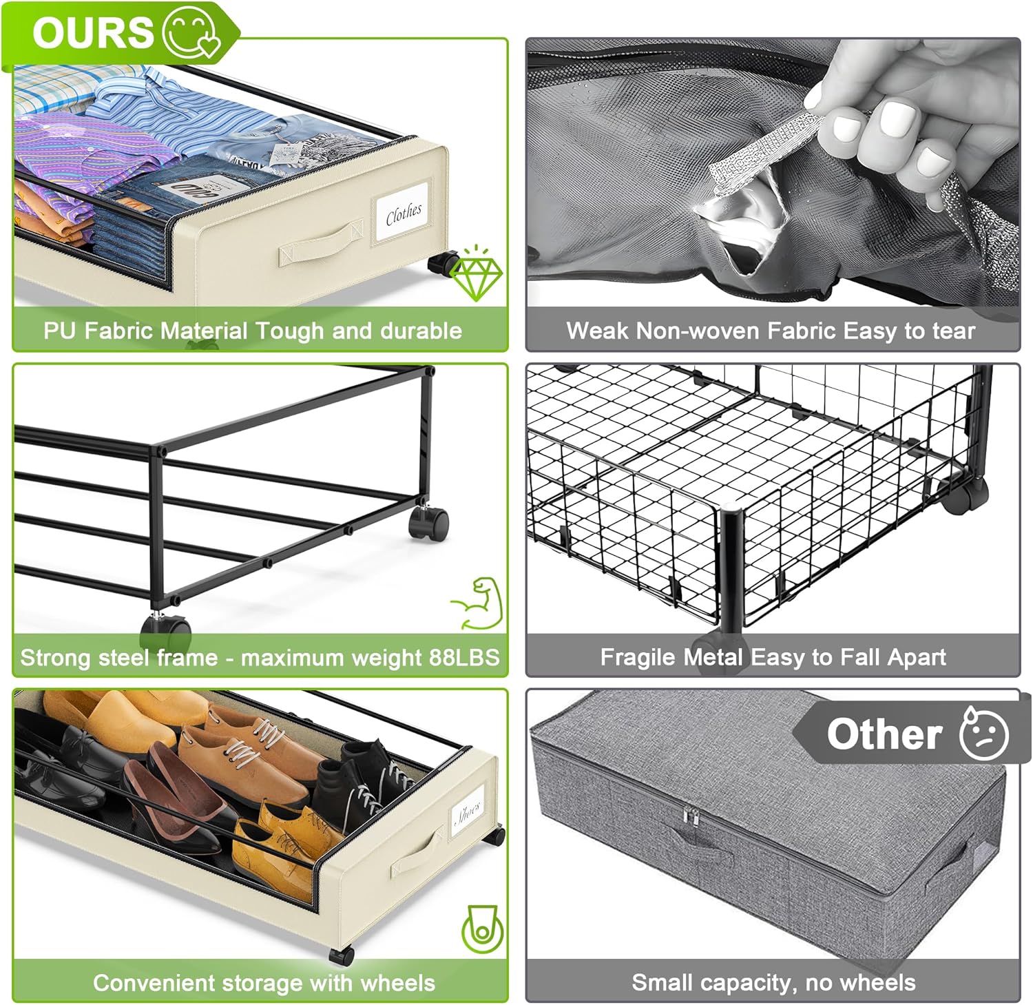 - 【360° Rotating Wheels】: Our Under the bed Storage Organizer is equipped with 2 side handle and 4 smooth 360° universal wheels that glide effortlessly on various surfaces, making it ideal for use in bedrooms, living rooms, shoe cabinets, basements, dormitories, lofts and other places. By removing the metal frame and wheels at the bottom, the under bed storage bins can be placed flat on top of or inside the wardrobe.