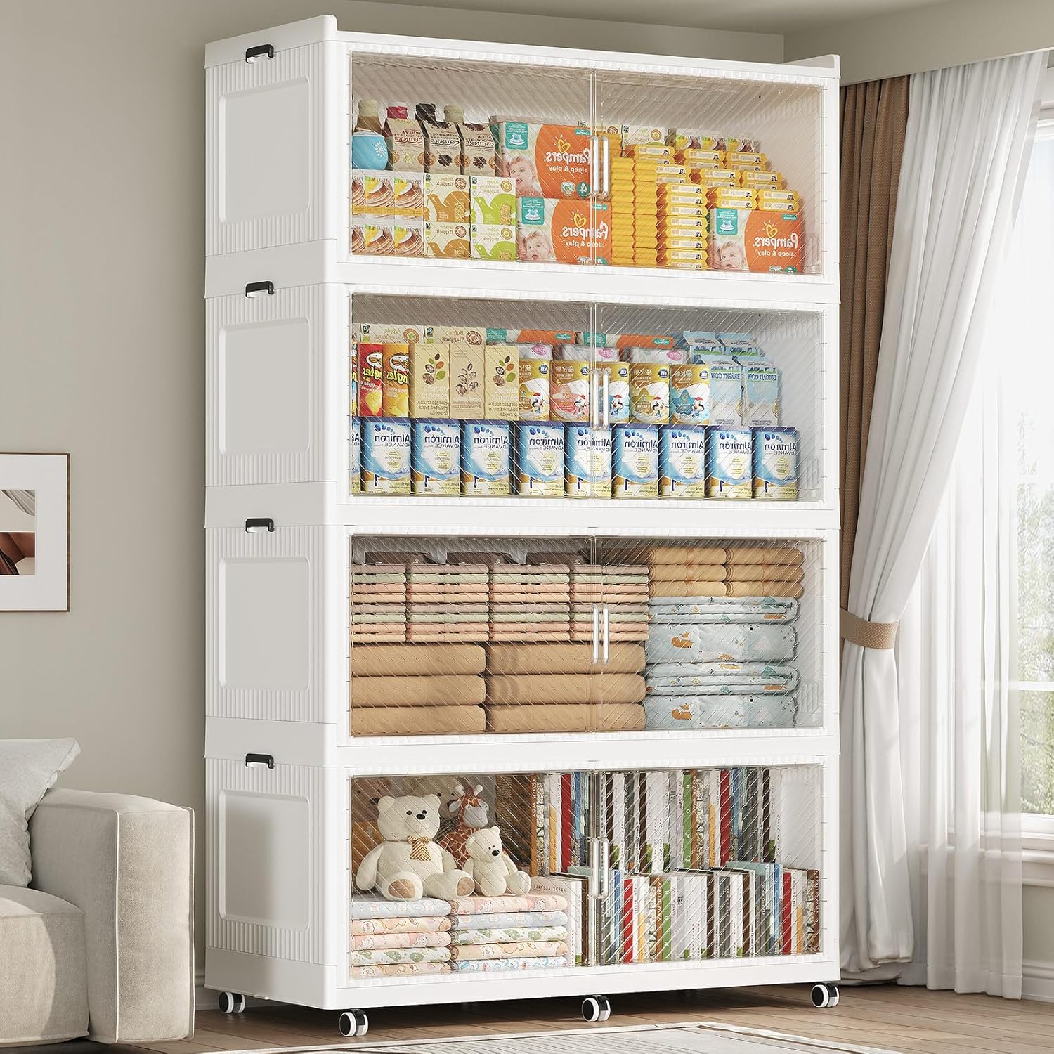 200GAL Extra Large Storage Bins with Lid, 800QT Collapsible Organizer with Wheels, Stackable Closet Cabinet with Doors, Folding Storage Containers for Home, Office, Dorm, 4Pack White