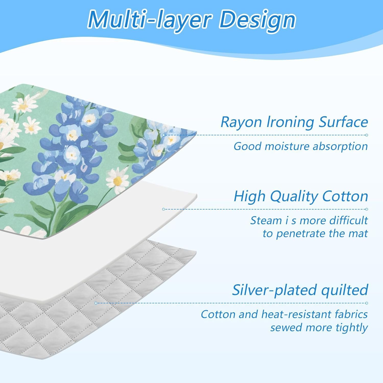 - High Quality:This ironing mat adopts a multi-layer design, with a surface made of Rayon lroning and good moisture absorption. High quality cotton in the middle makes it Steam more difficultto penetrate the mat. The bottom layer is coated with 210 silver-plated quilted, with cotton and heat-resistant fabricssewed more tightly. The ironing pad can be used on both sides, making it more durable