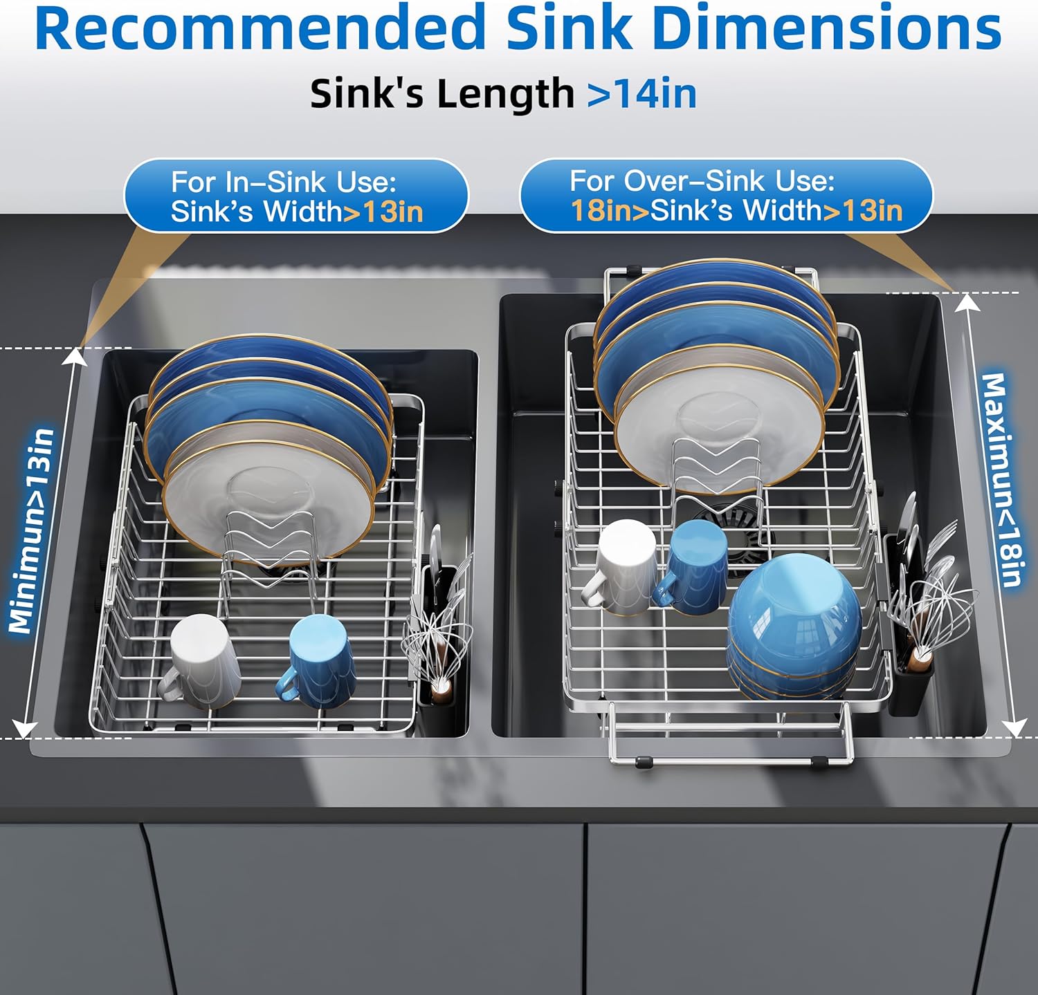 - 🔄Expandable & Space Saving Design: Width adjusts from 11.4" to 17.5" to fit most sinks single, double thick and rim. This expandable dish drying rack over your sink, maximizing counter space saving. Stainless steel dish drying rack holds plates cups firmly with non slip silicone pads. Ideal compact dish drying rack for small households.