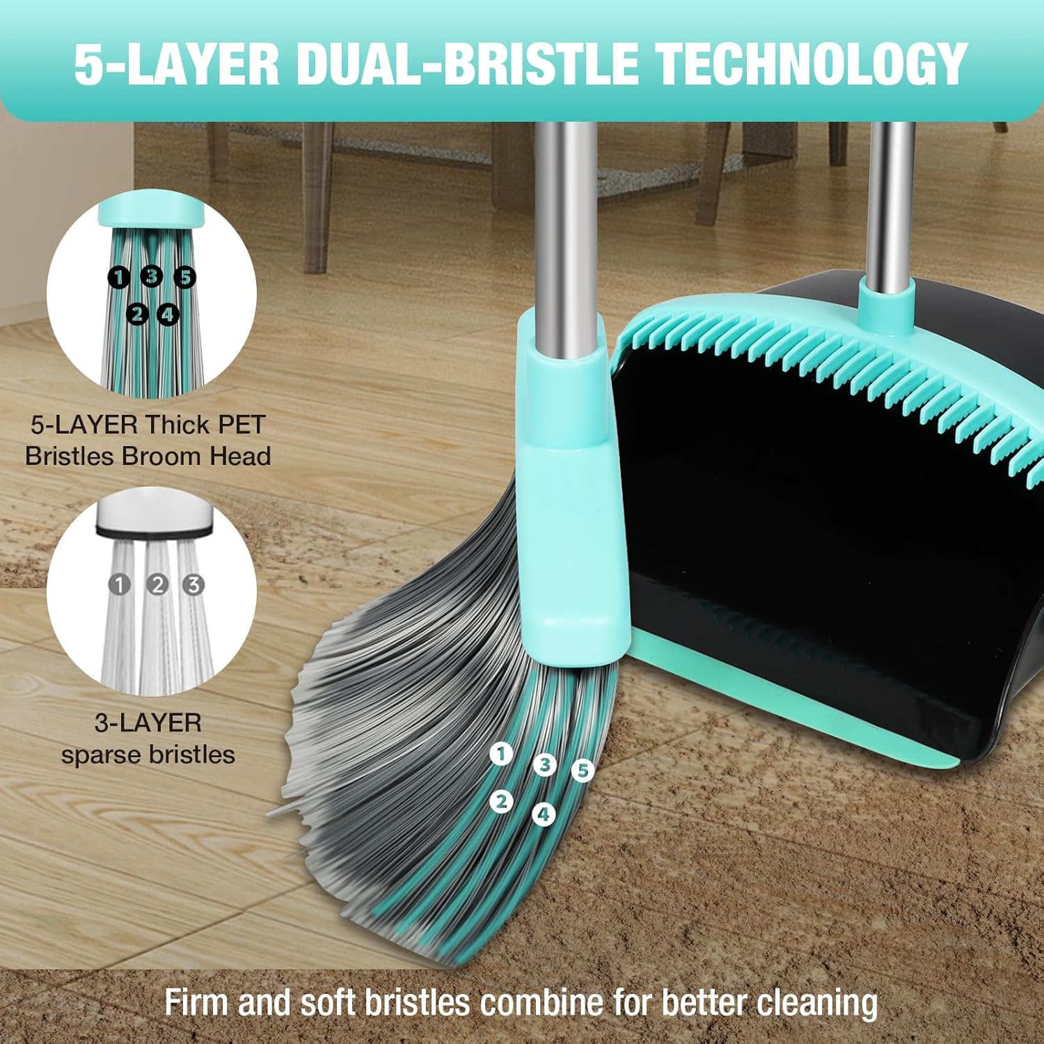 - Heavy duty Broom Bristles: This broom and dustpan set comes with unique 5 layers of high quality bristles, which cleans the floor more efficiently. Suitable for indoor and outdoor use, for tile floors, garage floors, and hardwood floor.