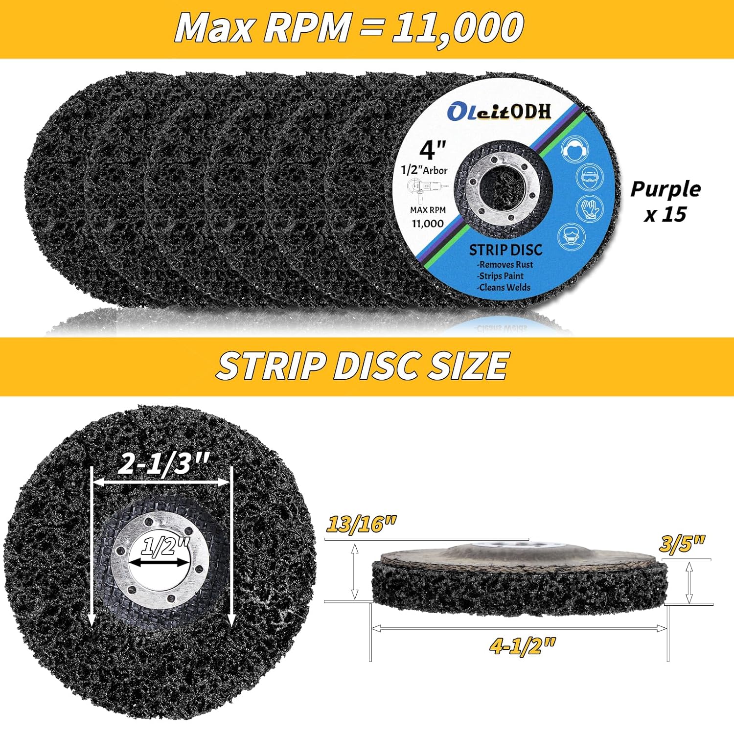 - 4.5" x 1/2" Strip Discs Bulk: The package includes 15 x black Paint Stripping Discand. our 4.5" x 1/2" strip discs effortlessly remove paint, rust, and oxidation, ensuring a smooth finish without damaging surfaces. Please be sure to wear a mask when using the strip disc to prevent inhalation of dust. We recommend that you wear gloves when using it