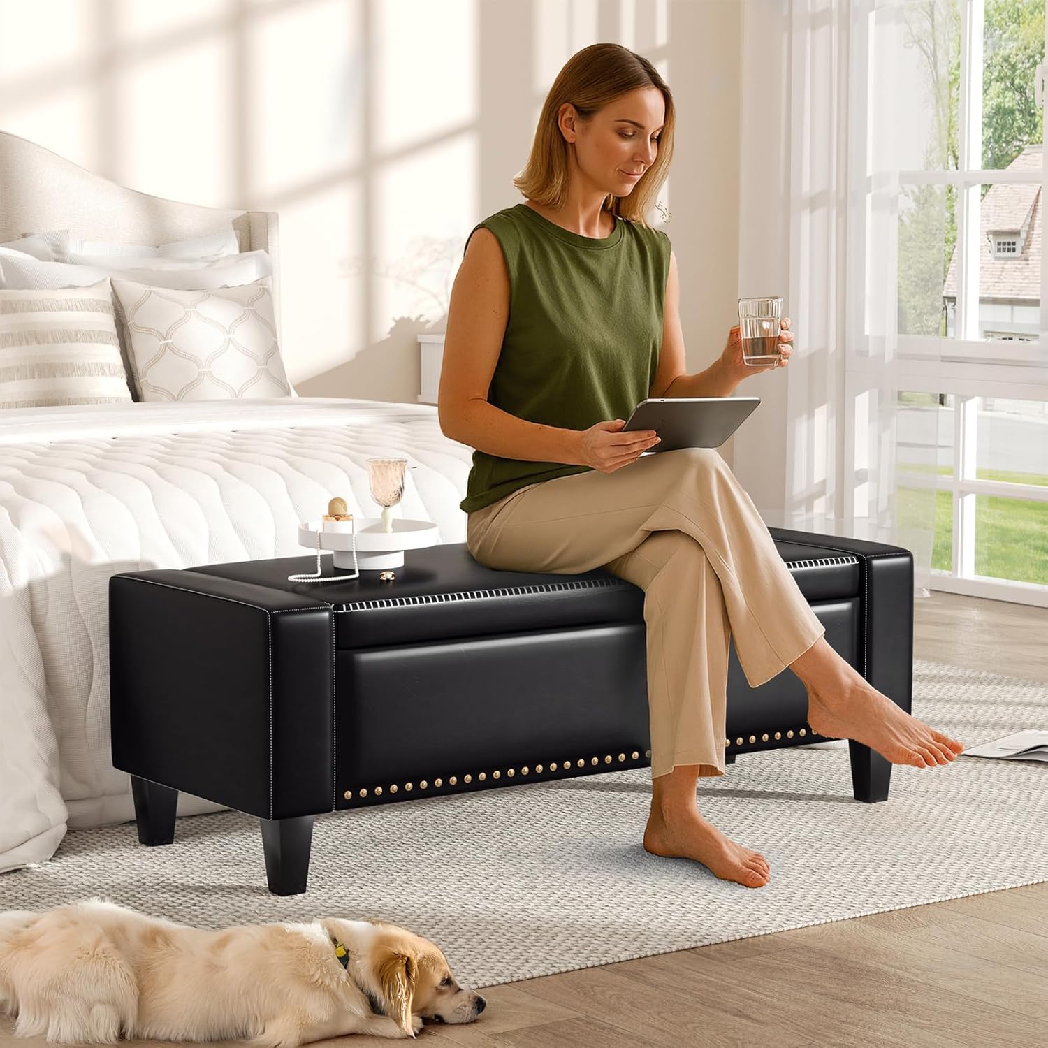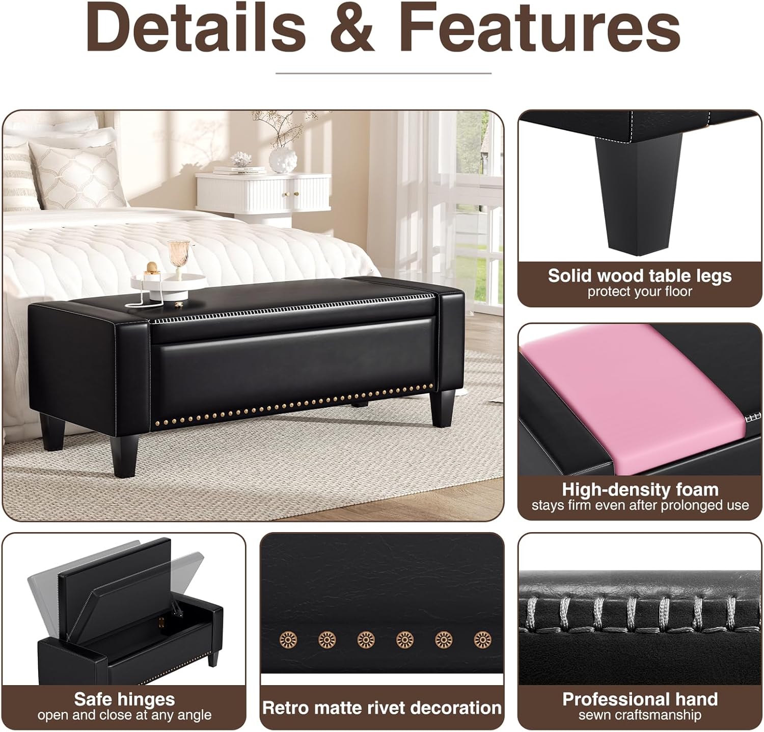 48.8" Storage Ottoman Bench Black | Faux Leather Bedroom Bench with Lift Top for Living Room & Bed End