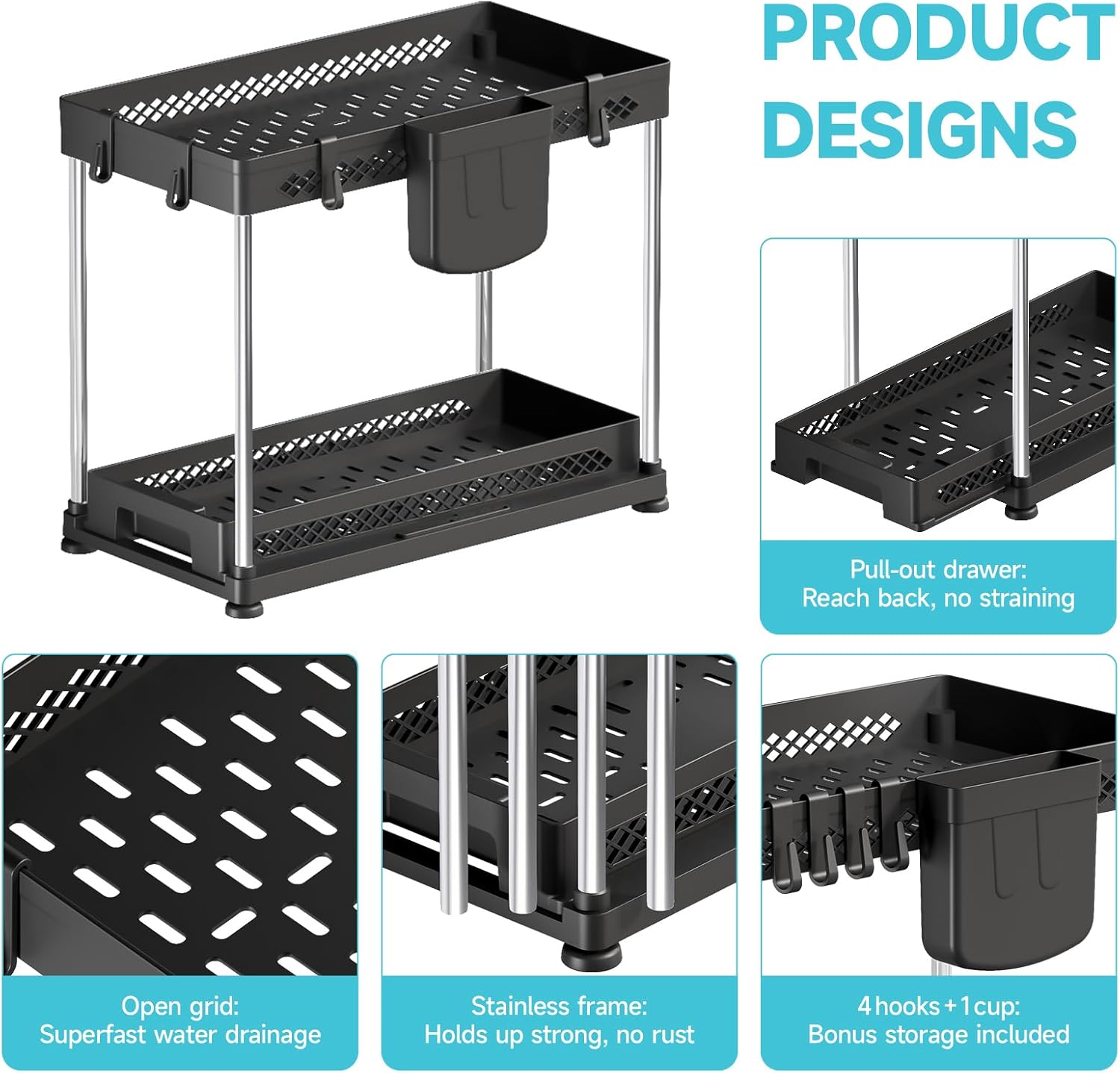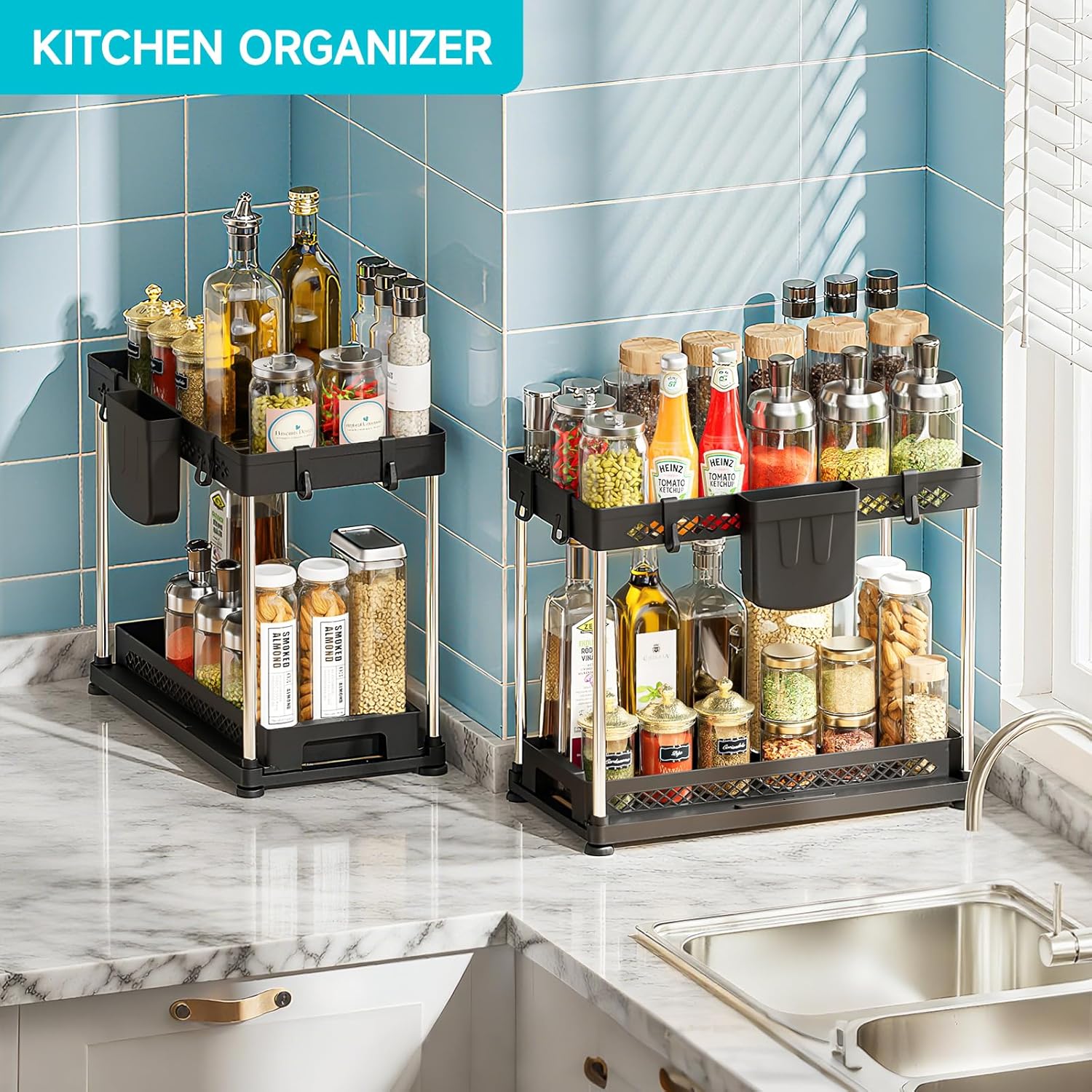 Under Sink Organizer, 2 Tier Pull Out Cabinet Organizer with Hooks Hanging Cup, Easy Installation & Rust-resistant, Multi-Purpose Storage Shelf for Kitchen Bathroom Pantry (Black, 2 Pack)