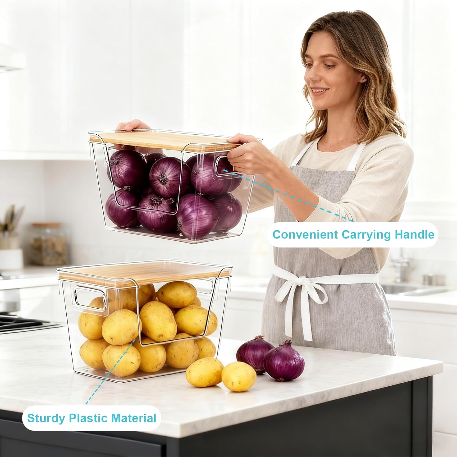 Stackable Trash Bag Dispenser with Bamboo Lid 2 Pack Clear Plastic Garbage Bag Holder, Potato Onion Storage, Kitchen Organizer for Countertop, Under Sink, Pantry