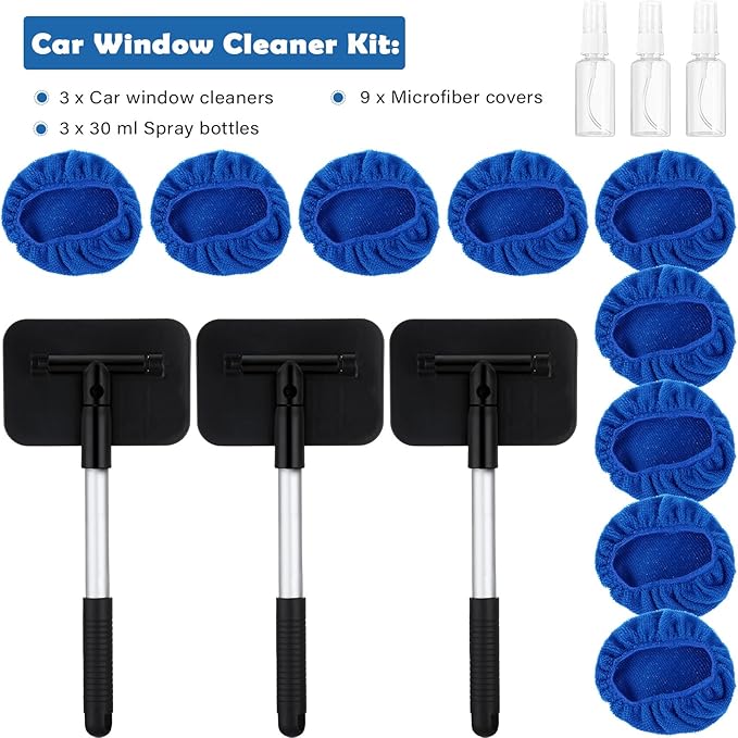 Frienda 3 Set Windshield Cleaner Tool Inside Car Window Cleaner Tool with 3 Extendable Handle 9 Reusable Microfiber Pads and 3 Spray Bottles for Auto Home Interior Exterior Glass Cleaning(Blue)