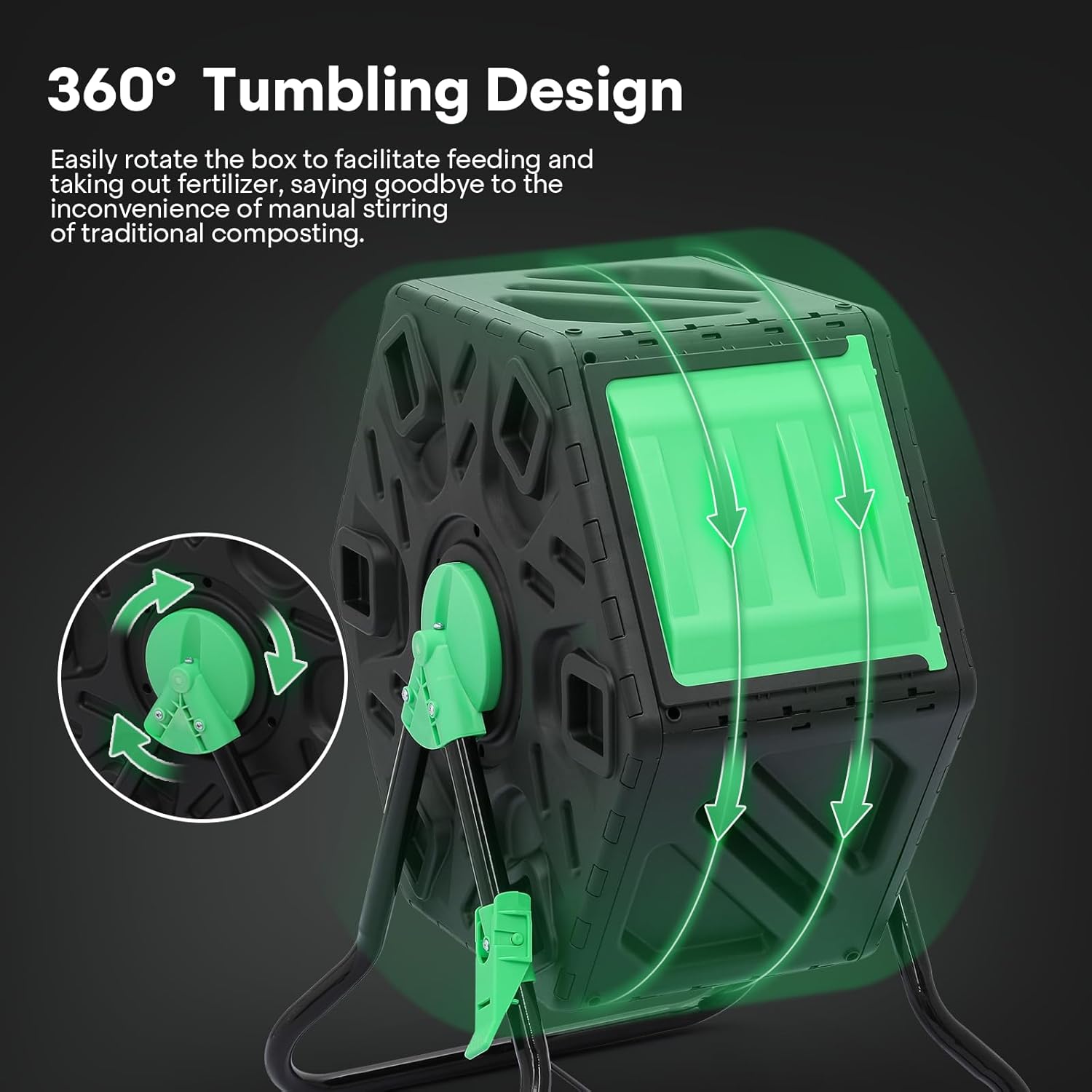 - Enhanced Aeration & Odor Control – Equipped with multiple ventilation holes and internal mixing fins, this compost tumbler improves airflow, prevents clumping, and accelerates decomposition. Better oxygen circulation helps reduce foul odors while keeping compost moist and balanced.