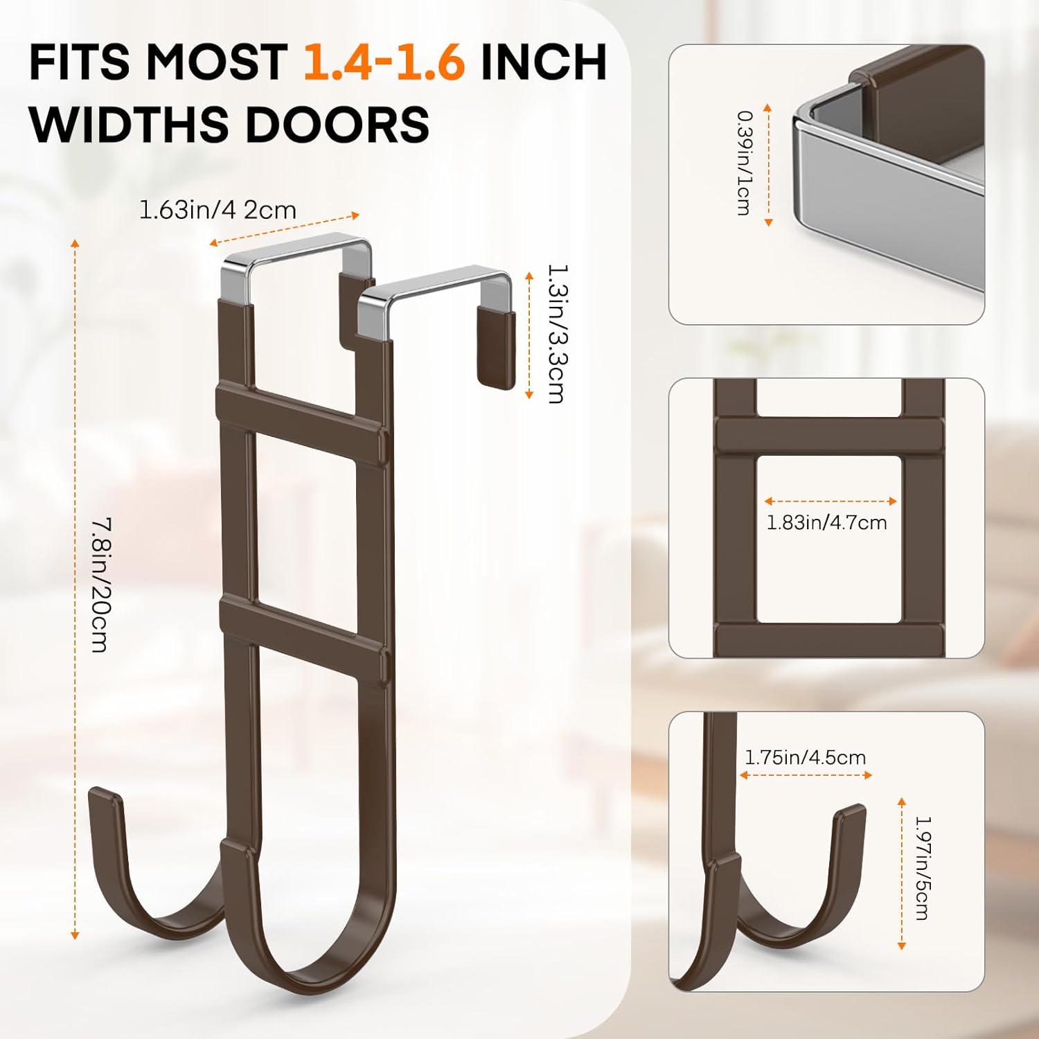- Size: This over the door hanger hooks length 7.8 inch, groove width 1.63 inch, fit most of doors which widths range of 1.4-1.6 inches. Please measure your door before purchasing