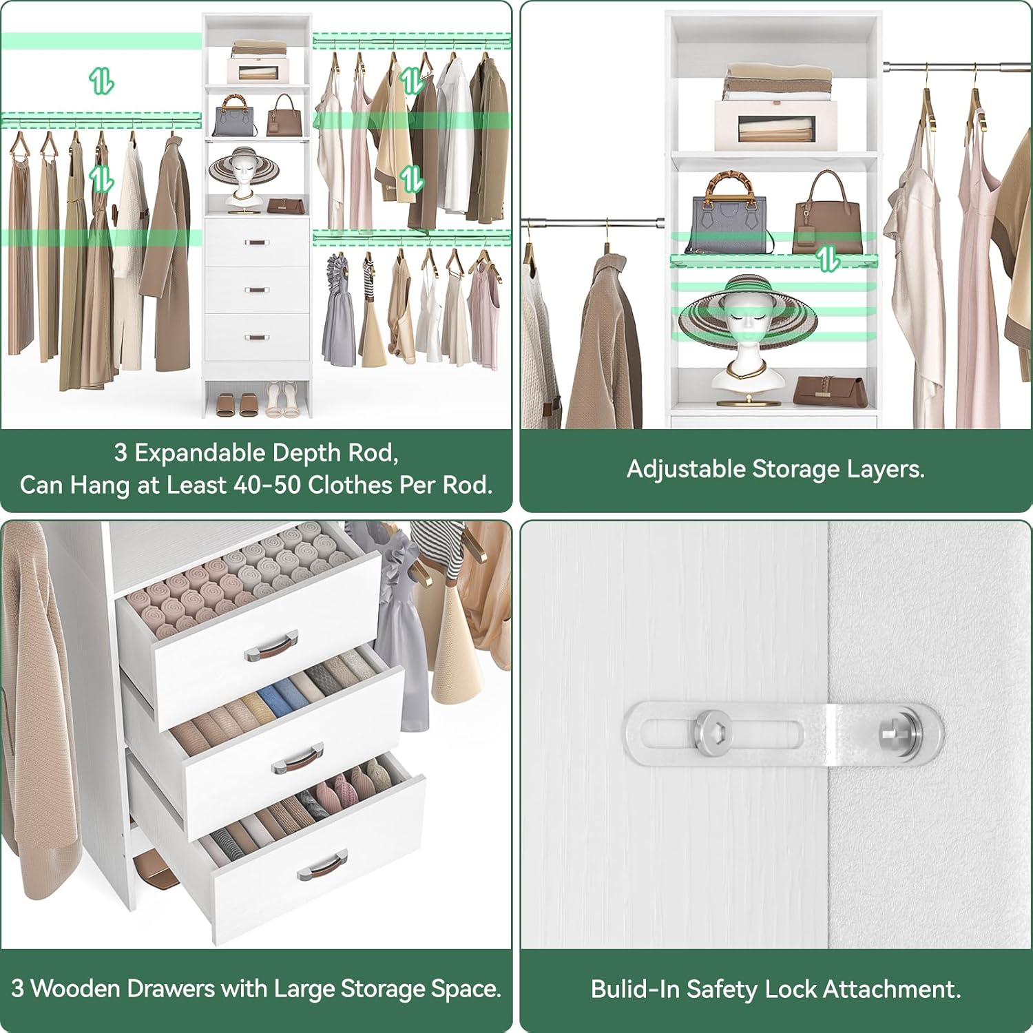 - About Organization and Capacity - This 8ft closet has 3 adjustable hanging rods, so you can hang the cloth on the hanging rods and you can also put clothes on the shelves too. It is a 500+ LBS and 150pcs clothes capacity closet organizer system.
