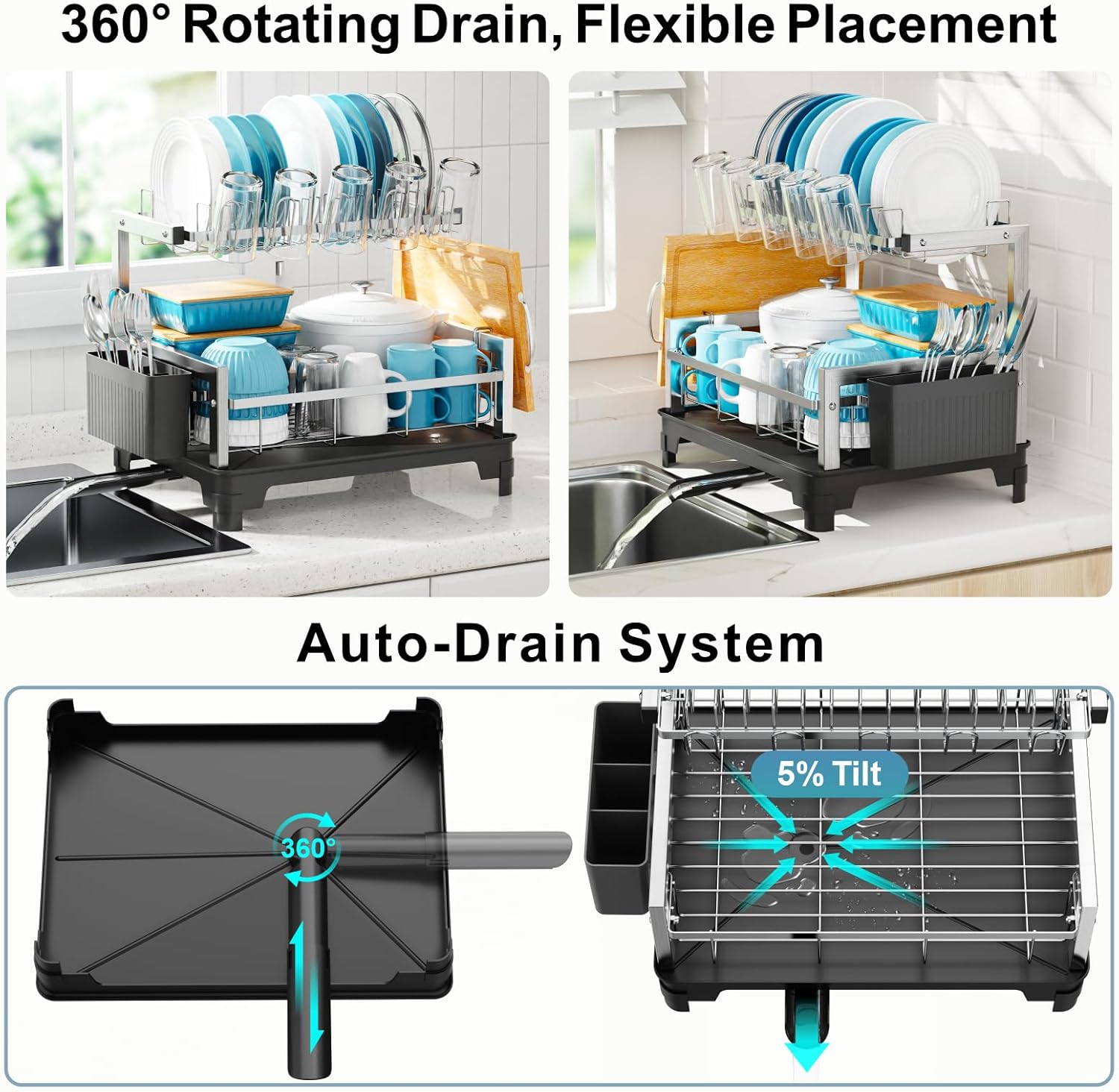 - 100% Stainless Steel, Rust-proof: Built from premium stainless steel, this stylish silver dish drying rack promises unmatched durability and rustproof performance. Dish rack with 360° rotating drain tube directs water straight into the sink, keeping counters dry. The elevated legs fits most raised sinks for hassle-free drainage.