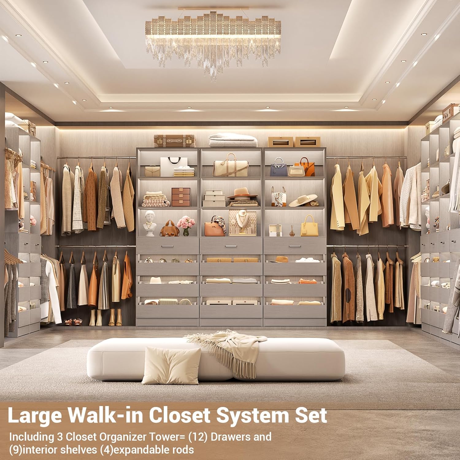 - 【ALL-IN-ONE Customizable Closet Organizer】Transform your space with a complete storage solution—featuring 3 closet towers, 12 wooden drawers, 9 shelves, and 4 expandable hanging rods (26"–47"). Designed to fit any closet size, this system offers flexible hanging space, ample drawer capacity, and adjustable shelves, keeping clothes, shoes, and accessories neatly organized. it creates a professional built-in look for bedrooms or walk-in closets—without costly renovations.