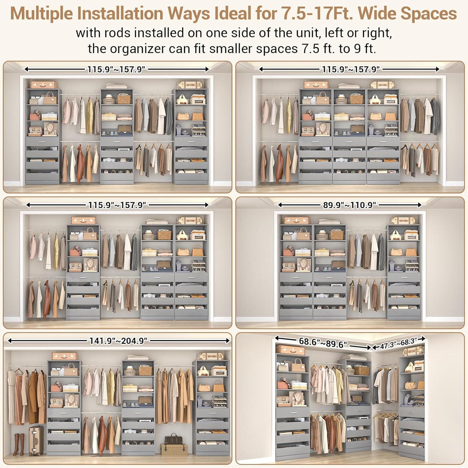 - 【Heavy-Duty & Durable Build】Crafted from premium MDF boards and reinforced metal pipes, the closets system ensures long-lasting stability and strength. Each hanging rod supports heavy loads without bending, while the overall structure stays wobble-free even when fully packed. You can cut/trimmed the rods at the end to fit your design.Includes anti-tip kits for added security, Compatible with Our Modular Storage Closet System.