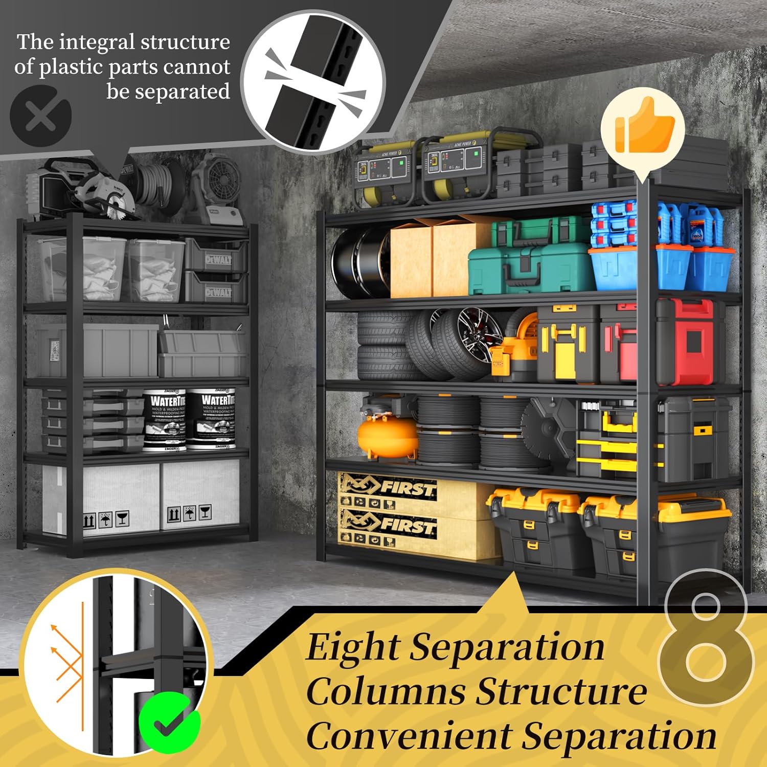 - Sturdy and Durable Construction: Built with high-quality metal and reinforced with double-thickened legs and an anti-rust coating, this shelving unit offers exceptional strength. Each shelf can hold up to 600 lbs, with a total weight capacity of 3001 lbs, making it ideal for heavy-duty storage needs.