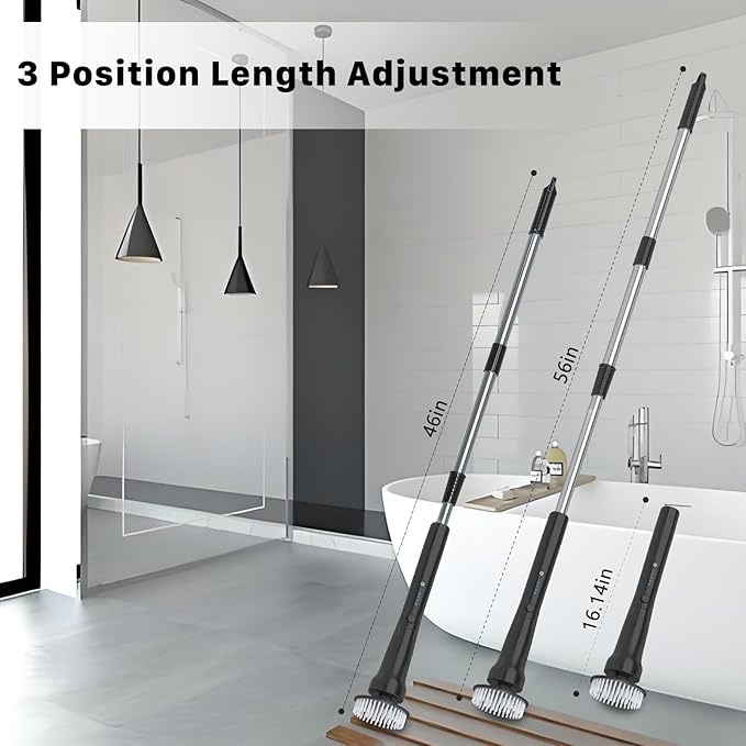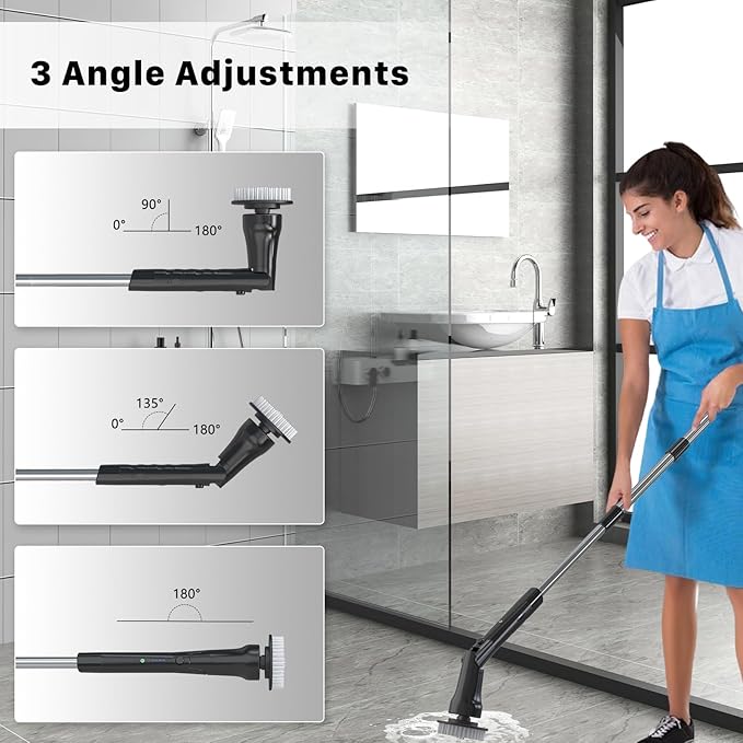 - 3 Speed Adjustable Length and Angle:Electric scrubber for cleaning provides12 inches, 43 inches and 54 inches; The brush head supports 180°/135°/90° angle, press the black button to adjust the angle, you don't need to worry about the dirt in the crevices