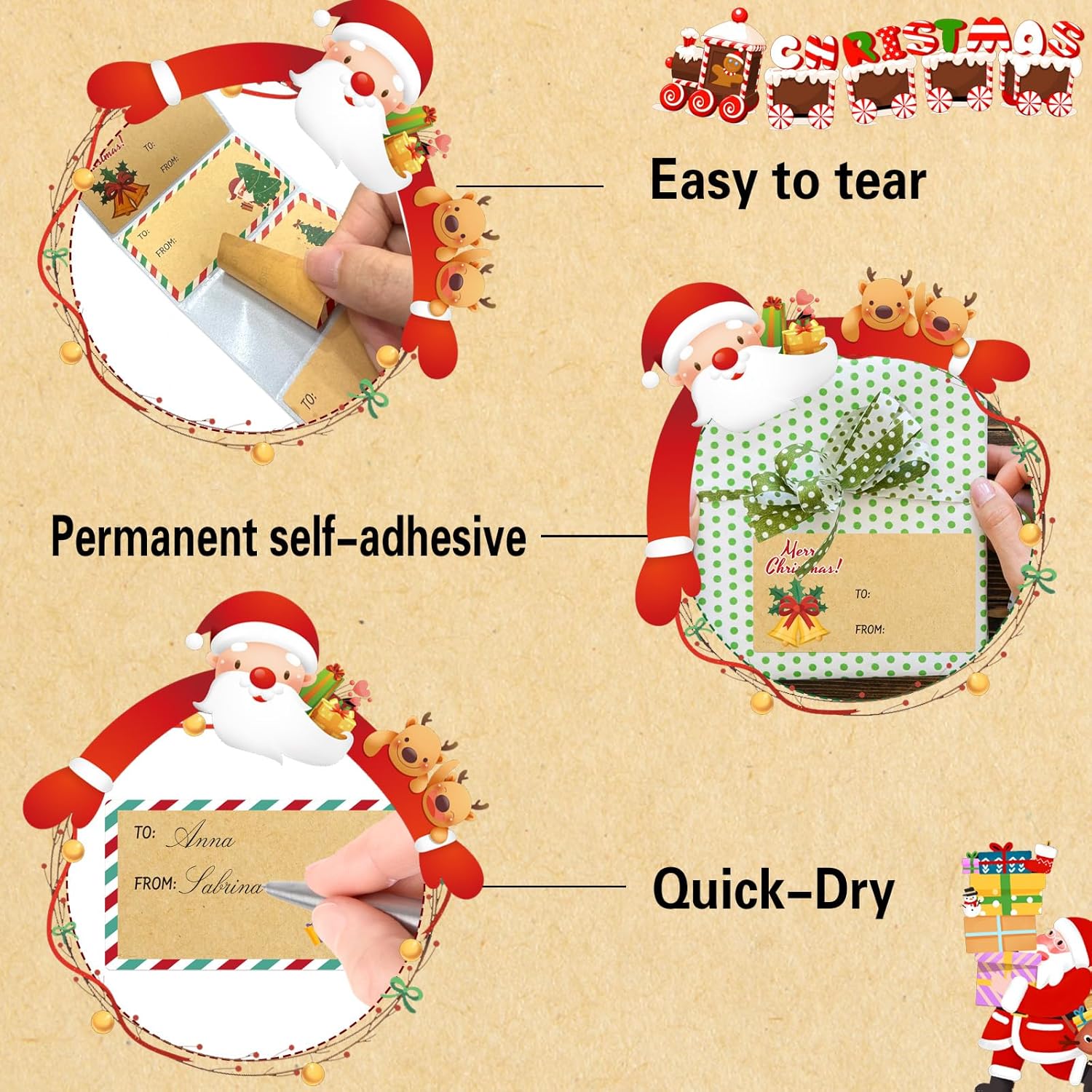 - Versatile and Stylish: Our Christmas gift tags are more than just labels; they are versatile accessories crafted from premium materials. These self-adhesive tags effortlessly adhere to gift wrap, gift bags, or even personalized ornaments, ensuring a seamless and elegant presentation for all your holiday gifts