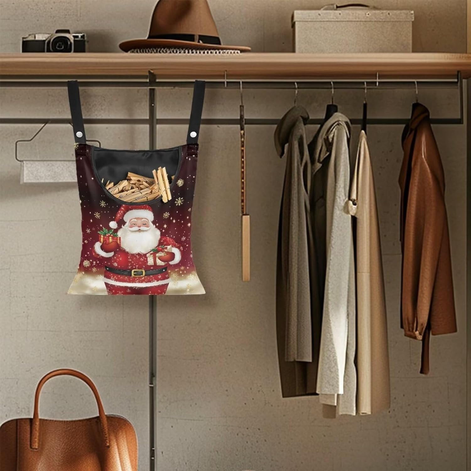 Christmas Santa Claus 2025 Waterproof Clothespin Pouch - Space-Saving Hanging Hook Bag for Holiday Laundry & Garage Storage