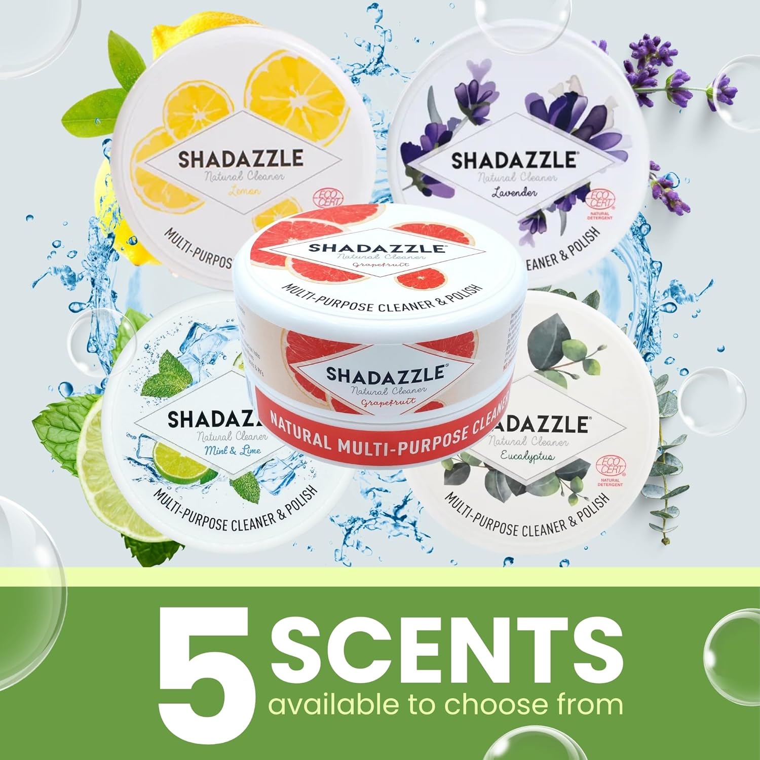 - NATURAL ALL PURPOSE CLEANER : Shadazzle is a multi purpose cleaner that works on any washable surface. It is made with natural ingredients only : clay, vegetal oil, vegetal glycerin, eucalyptus fragrance. No harmful chemicals or phosphates !