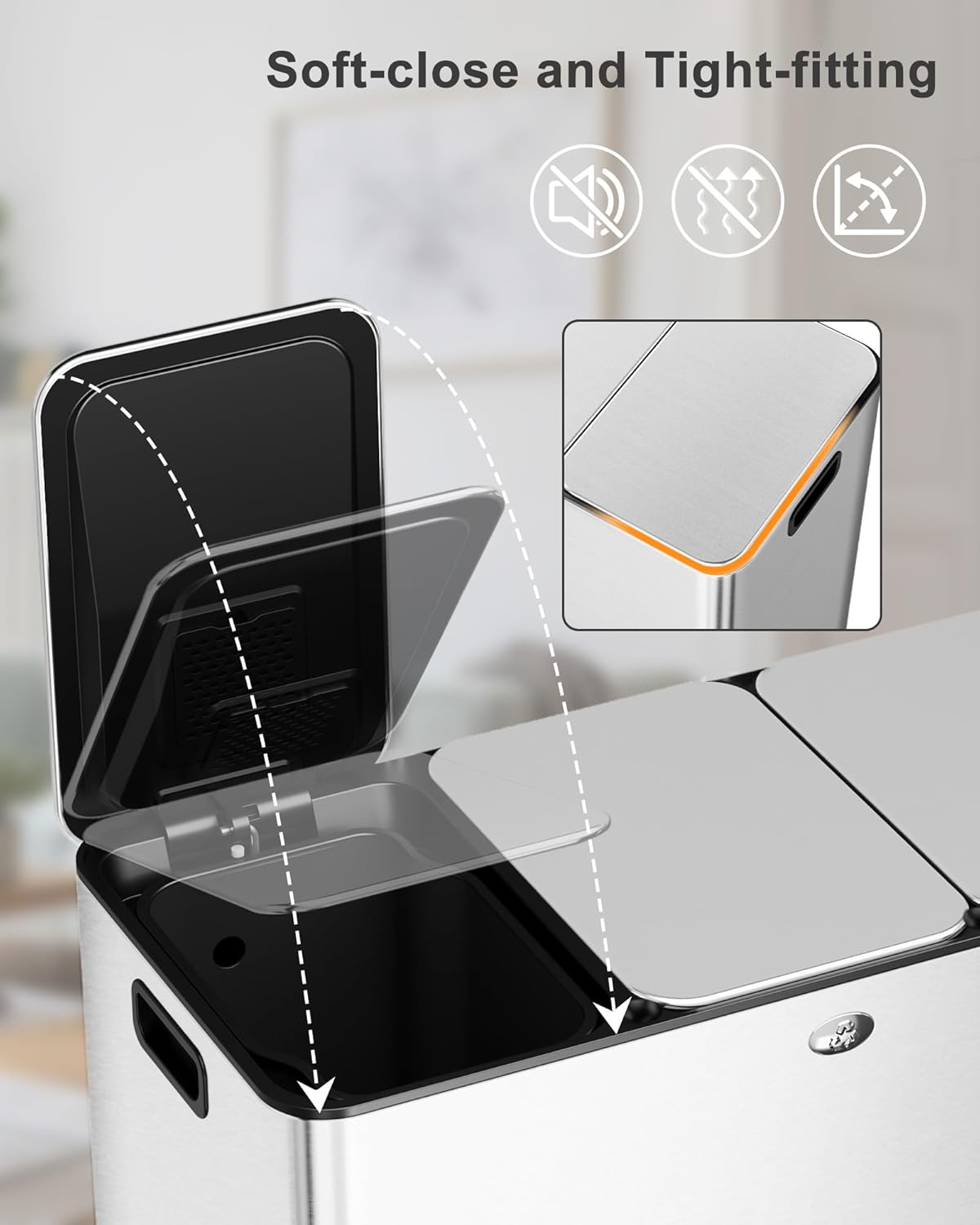 - Triple Compartment Design: Features three 7.9-gallon (30L) inner barrels for effortless sorting of dry/wet, recyclable, and non-recyclable waste—ideal for efficient kitchen organization.