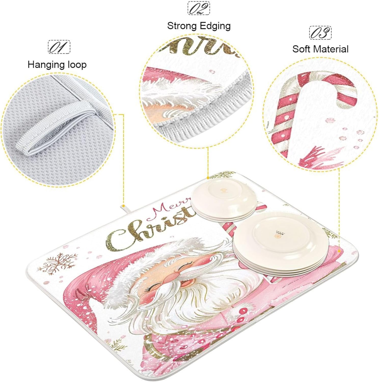 Christmas Santa Claus Pink Dish Drying Mat for Kitchen Countertop 18x24 Xmas Candy Cane Snowflake Large Drying Mat Reusable Quick Dry Dish Sink Mats Easy Clean Decorative Essentials
