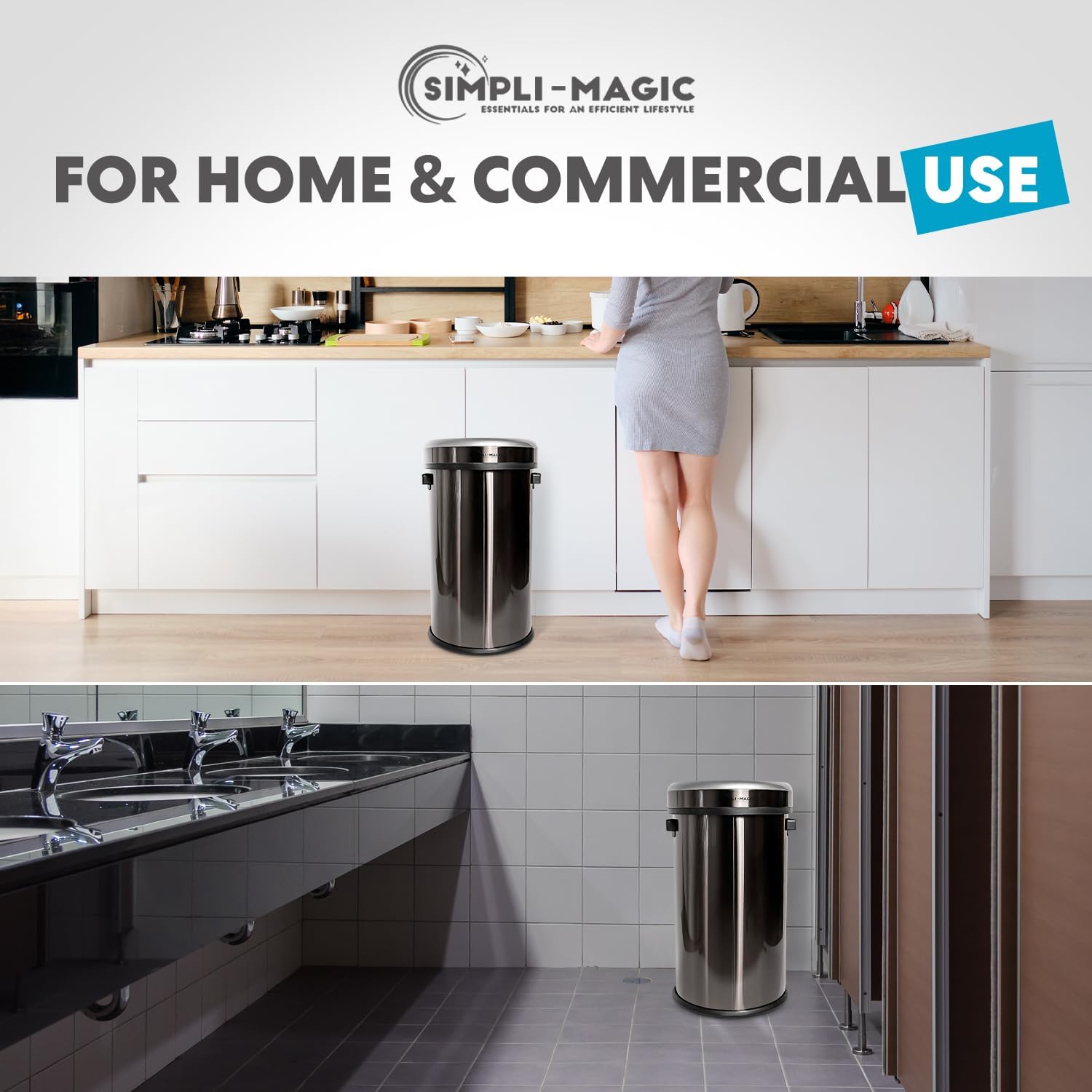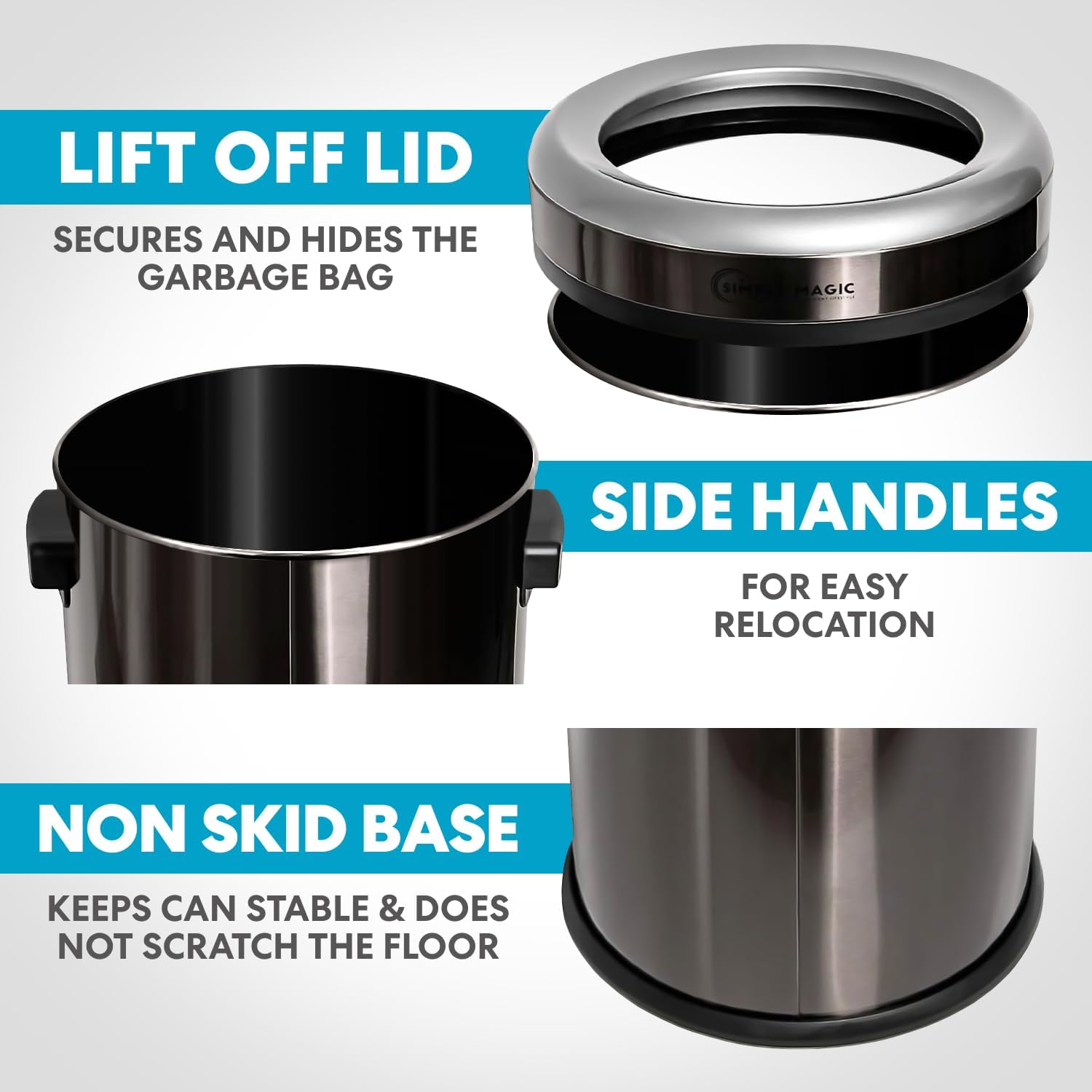 - QUICK & EASY DISPOSAL – Open Top design is perfect for Commercial Spaces and Busy homes: Restaurants, Restrooms, Offices, Lobbies, Stores – Quick & Easy Trash Disposal