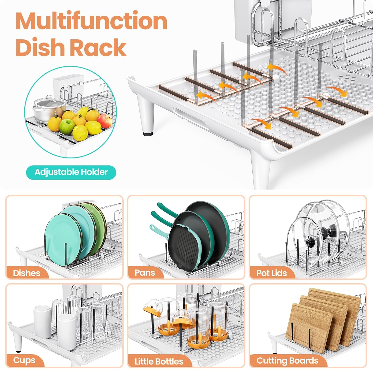 - Adjustable & Spacious: Expands to fit most countertops; holds plates, bowls, cups, pots & pans. Collapses compactly for sink/cupboard storage