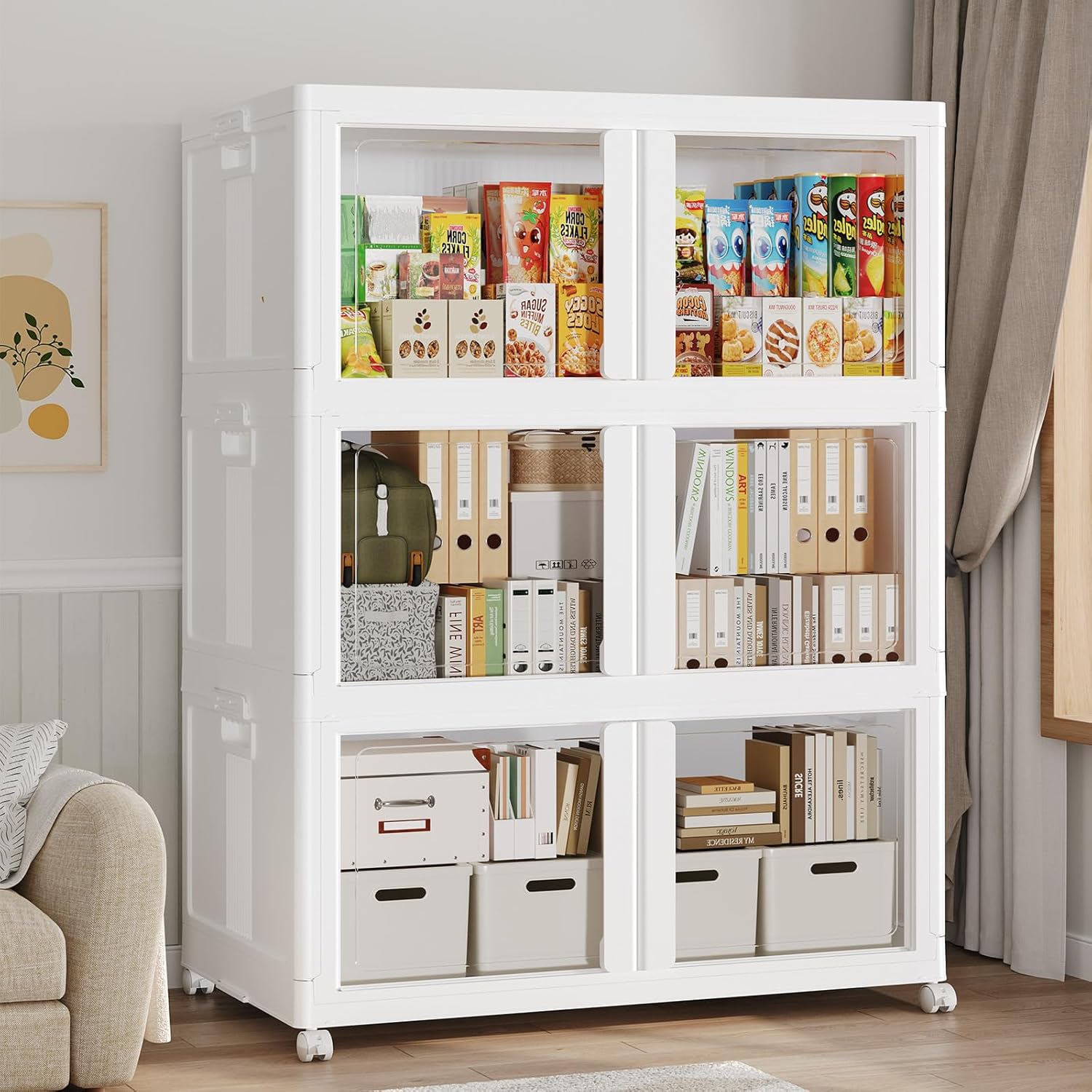 150GAL Large Stackable Storage Bins with Lid and Wheels, 600Qt Collapsible Organizer Cabinet with Clear Door, for Closet, Bedroom, Kitchen, Garage, 3-Pack White