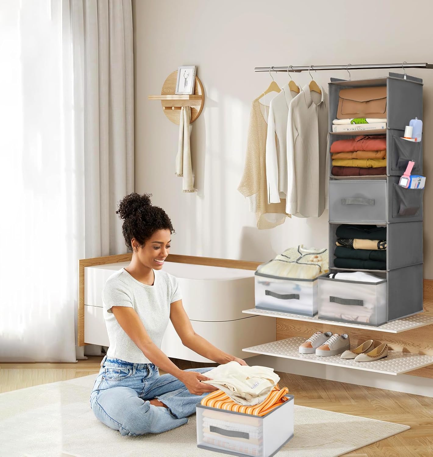 5-Tier Hanging Organizer for Closet, Fabric Closet Organizer with 2 Hooks, 2 Pull-Out Drawers, Foldable Space-Saving Storage (Gray)