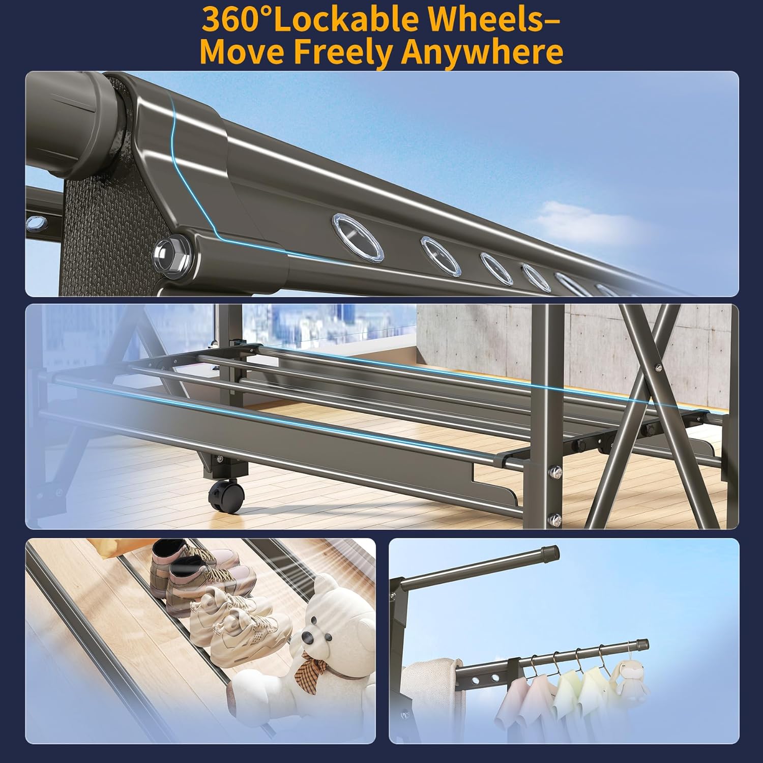 - Enhanced Drying Design with 4 Upgrades – Evenly-spaced windproof holes speed up drying, telescopic rods support multiple drying methods for different garment lengths, upgraded mesh shelf keeps sweaters flat without deformation, and reinforced crossbeam ensures stability and durability.