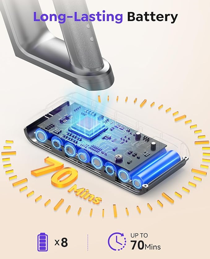 - ➤【 Max 70-min Battery Life 】 Equipped with the high-end 8*2800mAh battery pack in the market, which radically extends battery runtime. When fully charged (4 hours), the stick vacuum can operate for 20 mins in max suction mode and up to 70 mins in min suction mode, easily handling large-area cleaning tasks without frequent charging.